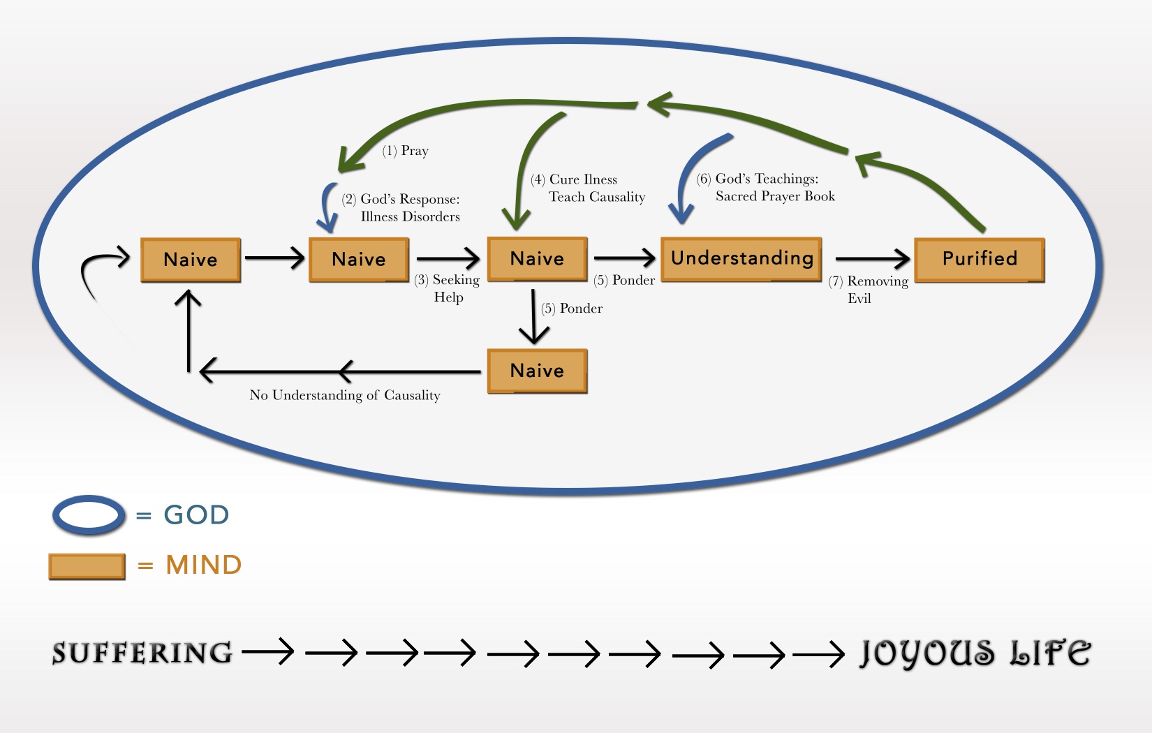 - Praying to God (Joyous Service) to decrease the time lapse between the “cause and effect”. This makes it easier to understand the relationship between our mind and body (causality).