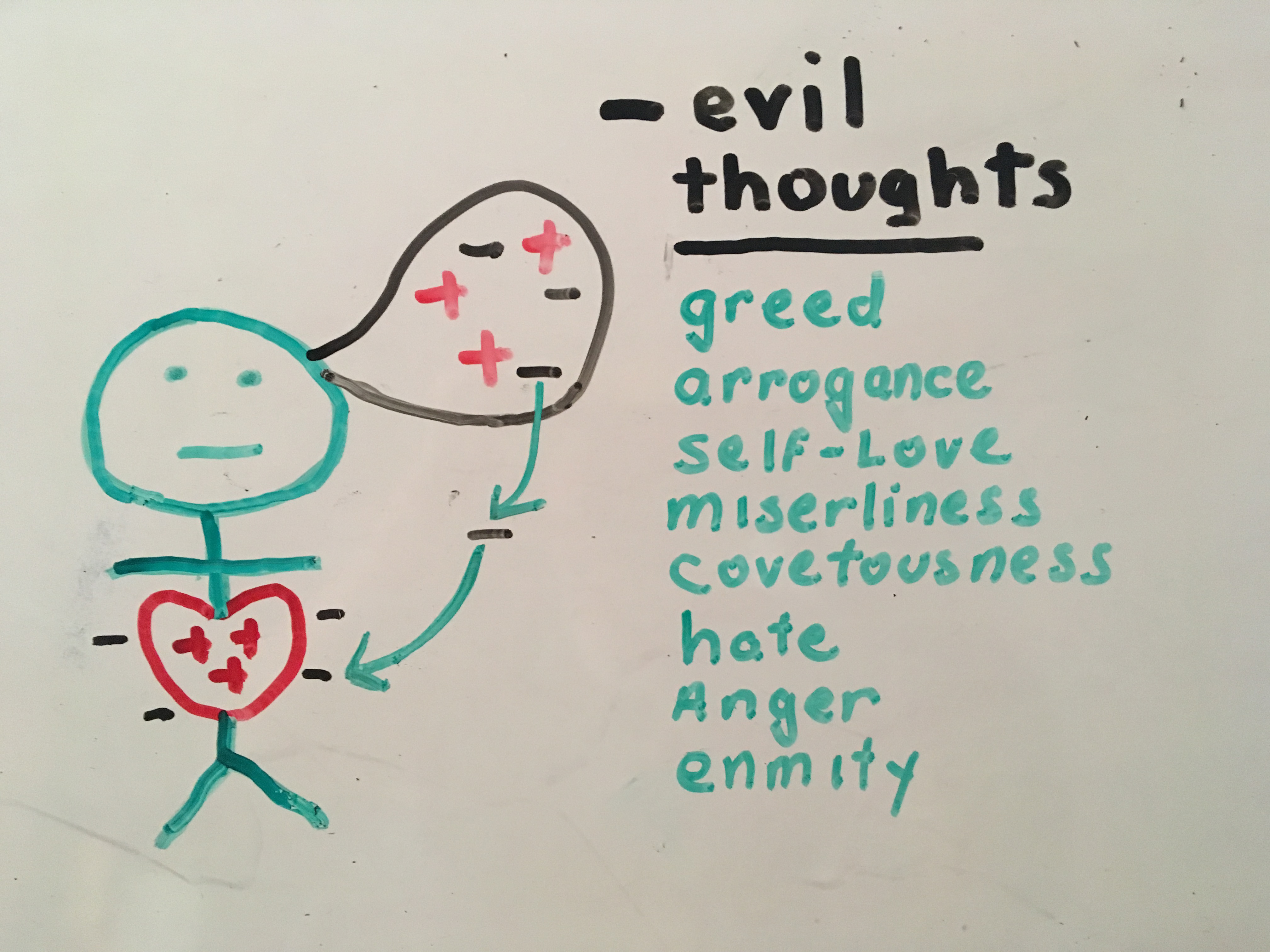 How does the soul eliminate evil from our minds? If we calm our minds and ponder the existence of evil thoughts in our minds; and do not act on them when faced with what the soul metes out (sufferings, inconveniences and temptations), these thoughts from our minds gradually subside. We do not produce more evil thoughts (see figure 1-8). Our minds becomes pure, and the evil surrounding our souls are eliminated. This results in a pure soul void of negative energy, which brings upon a joyous life for the individual.