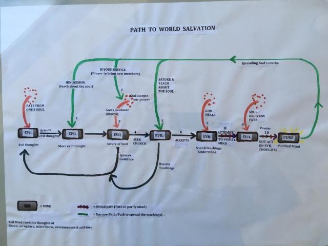In our religion of Tenrikyo, God gives us instructions on how to save ourselves first, and how to save the world. These instruction are written in the Ofudesaki. I place world in bold because God promises that everyone will be saved. I have summarized the instructions in our sacred book below in a flow chart. For a comprehensive explanation, please visit heaventruth.com and click Ofudesaki in the menu bar.