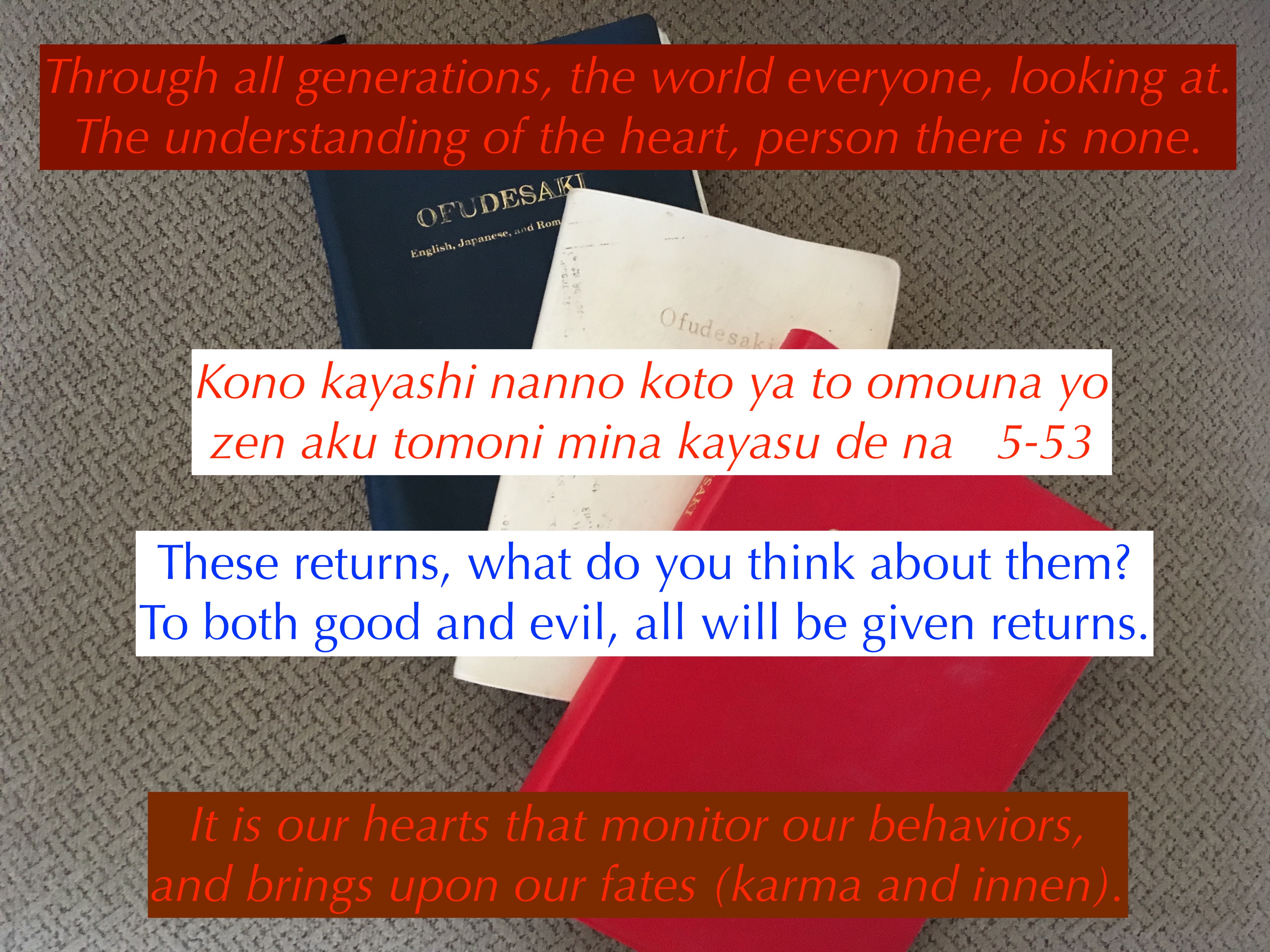 God is showing everyone that it is our actions that bring bring upon our fate. We reap what we have sowed. It is our minds that we must purify, because our actions come from what thoughts or dusts are in our minds. These dusts in our minds are the thoughts of greed, arrogance, self-love, covetousness and regret. By these returns or guidance, God is showing us what thoughts are in our minds.
