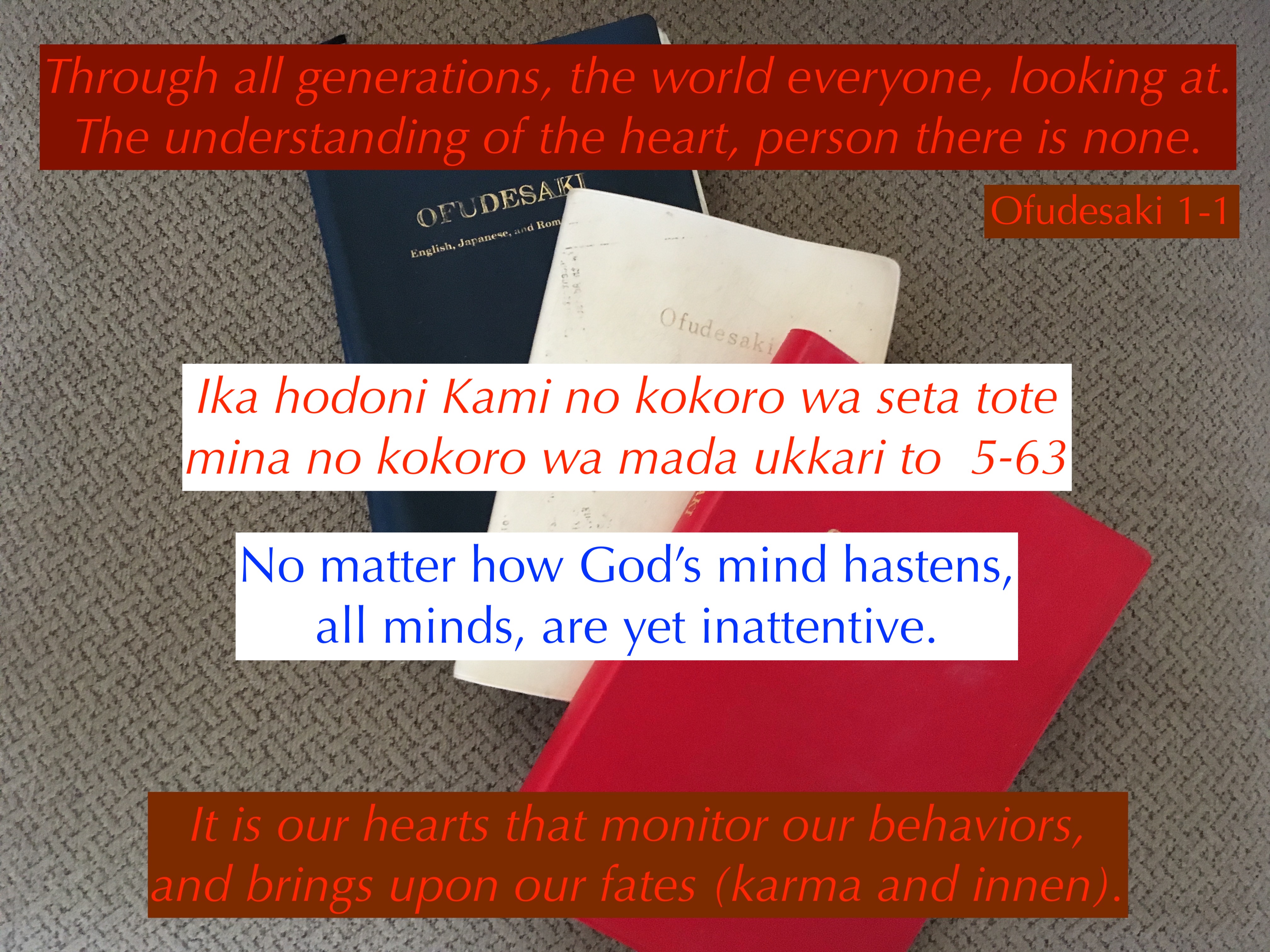 God is hastening the salvation of everyone; but we are still not aware of the importance of the heart, in purifying our minds. In the first verse of the Ofudesaki, God reminds us that we do not understand the heart.