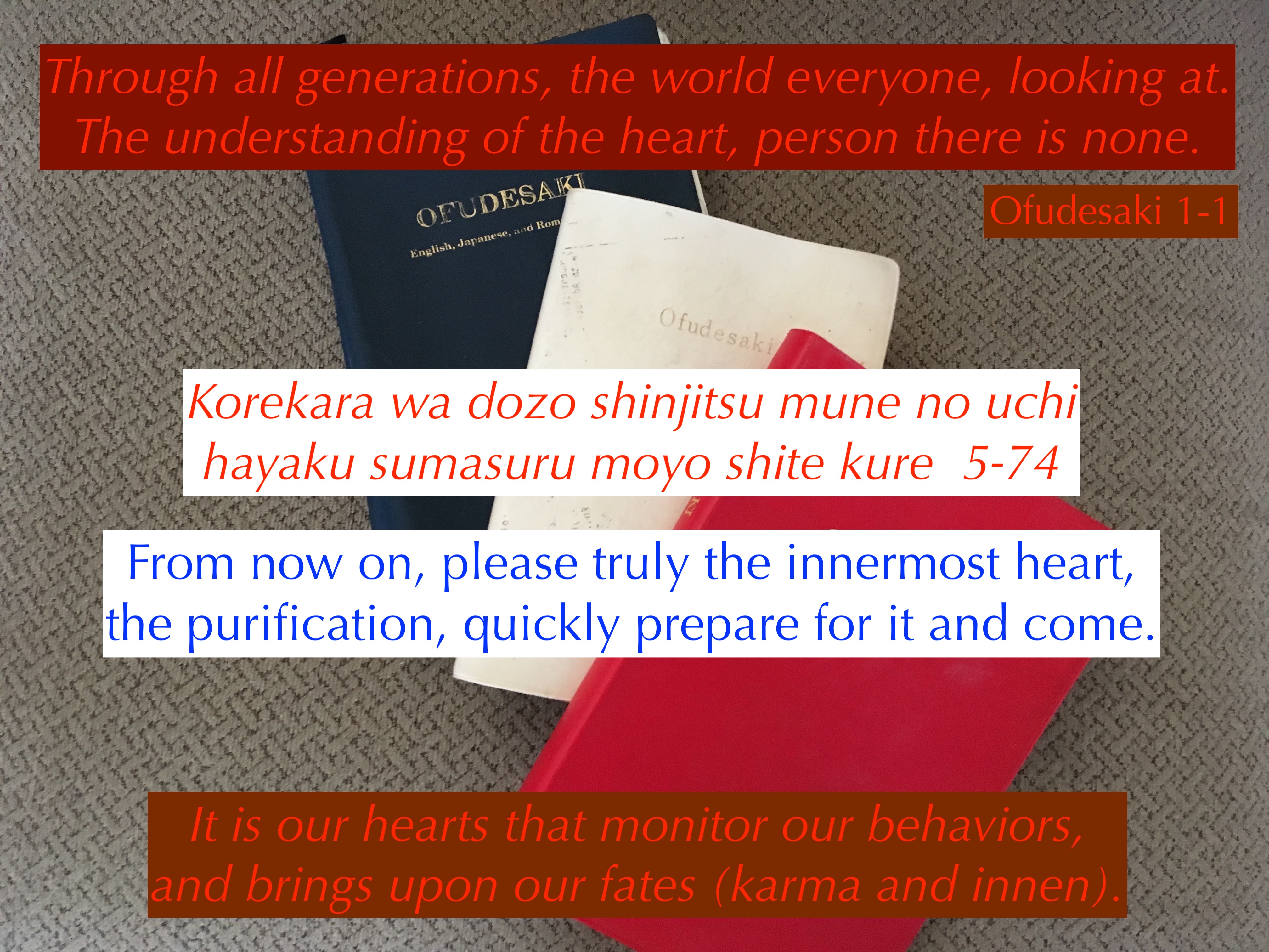 To purify the heart, one must understand that our fate comes from our own hearts. We reap what we have sowed. What fate comes from our hearts, we must ponder what dusts are in our minds. If we do not act on our evil thoughts or dusts, we can purify our minds and our hearts. With this process, our hearts will eventually become pure, and result in only joy coming from it.