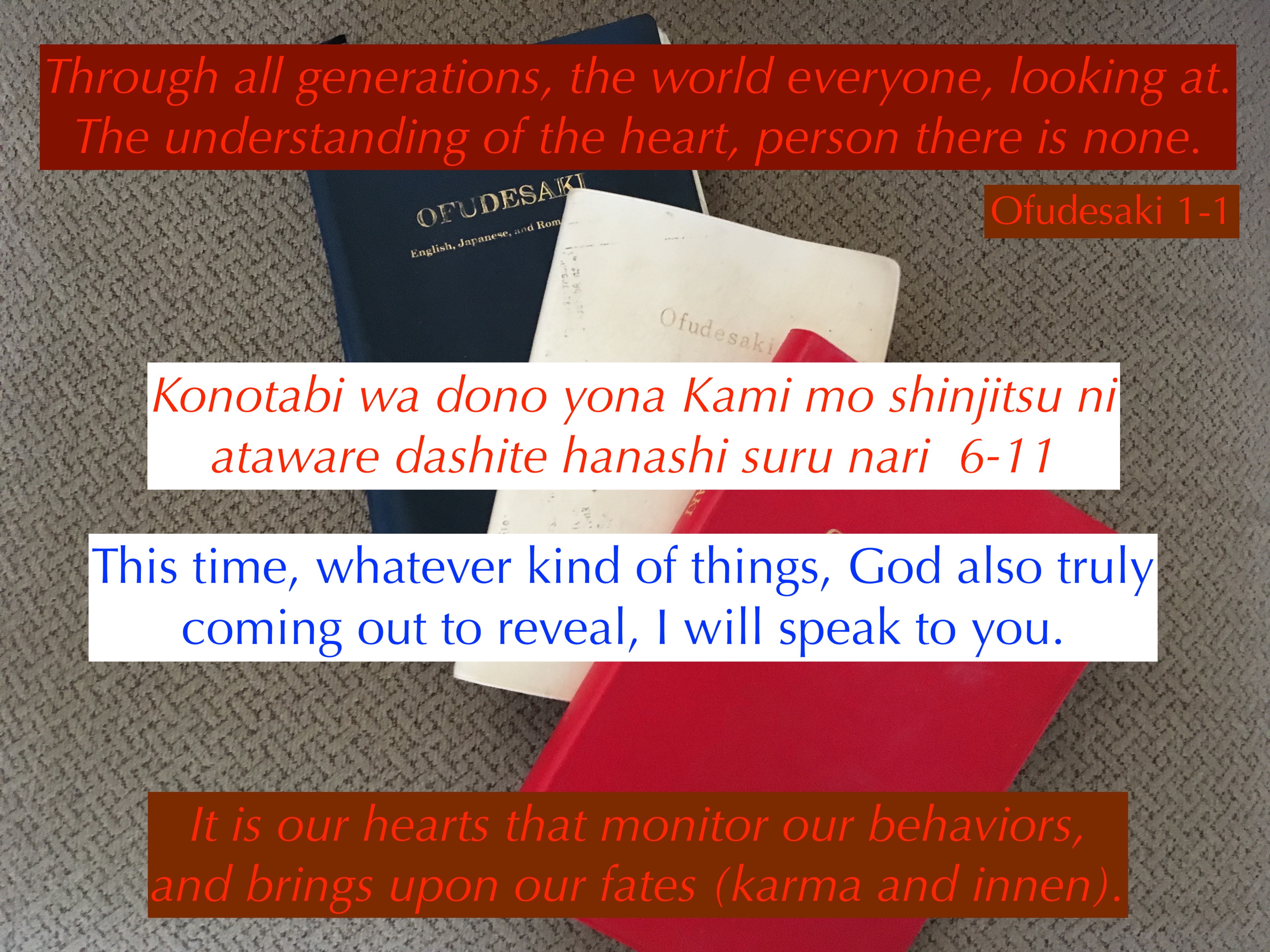 God through Oyasama’s writing in the Ofudesaki, speaks to the early followers. The writings in the Ofudesaki are still relevant in our daily lives. All the instructions to save ourselves and the world are all written in the Ofudesaki.