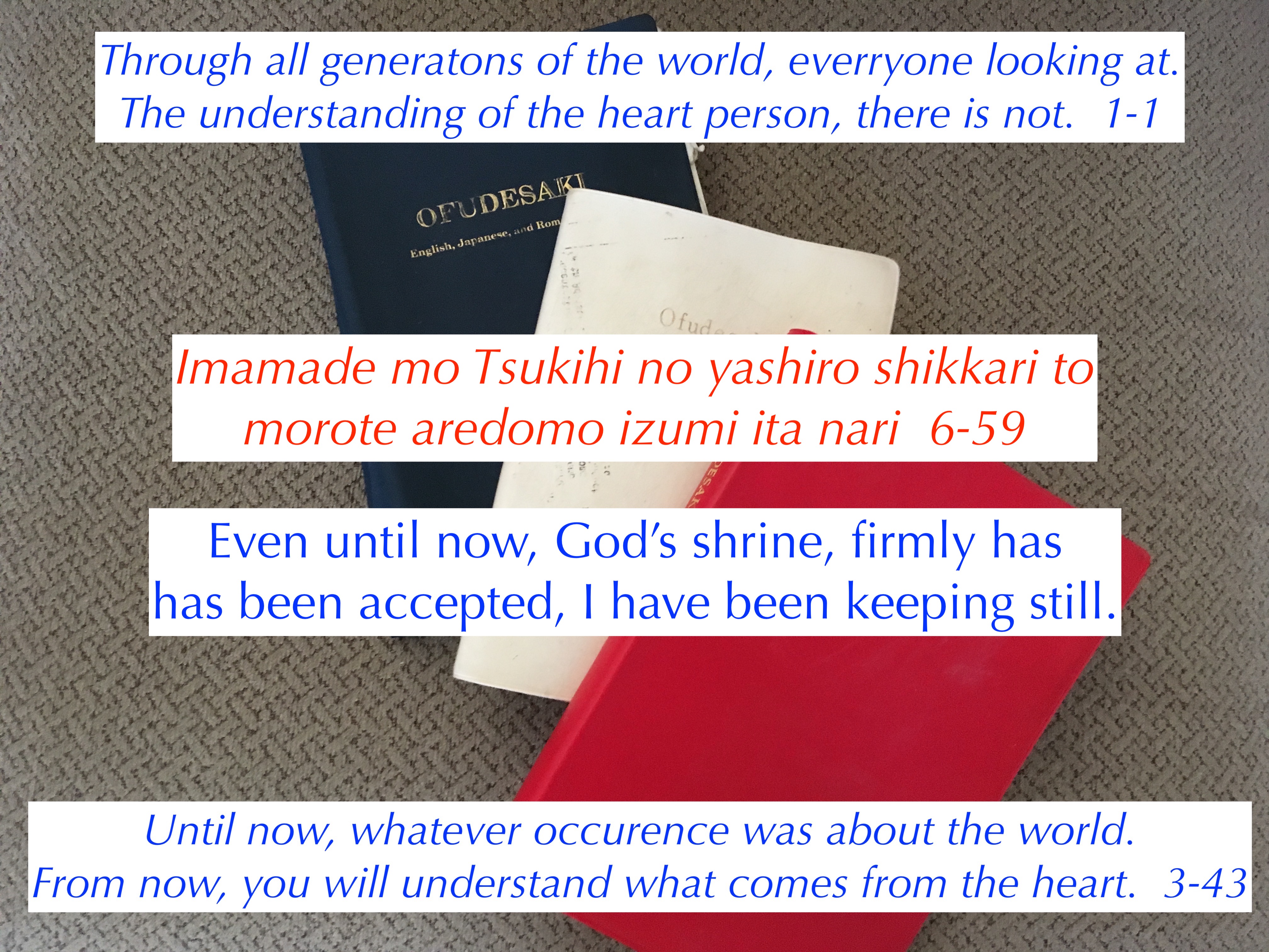 God is telling us that since the creation of human beings, God has just been watching us. One may wonder, what or who causes joy and suffering in the world? God may give us a clue in the first verse of both the Yorozuyo and Ofudesaki.