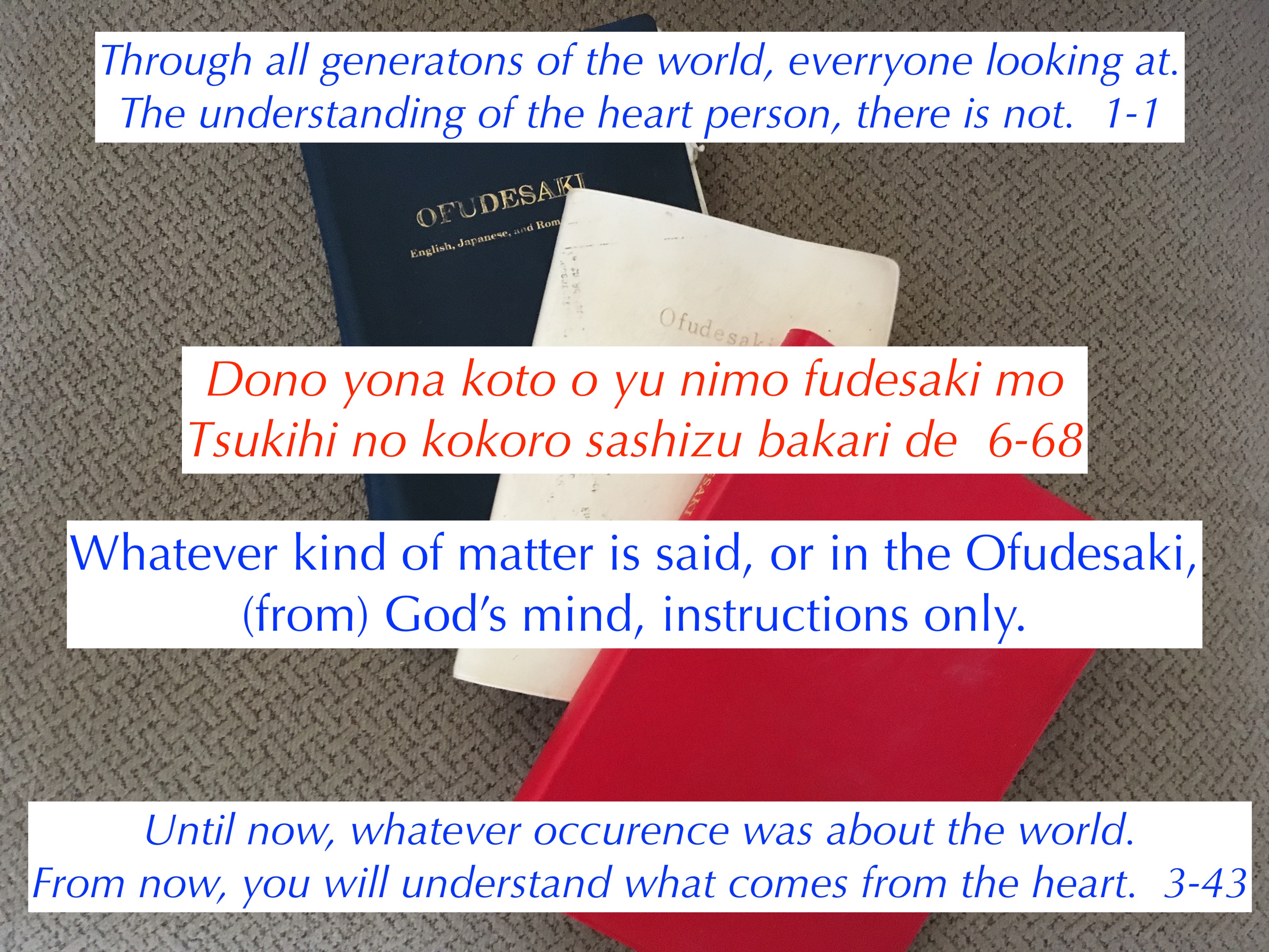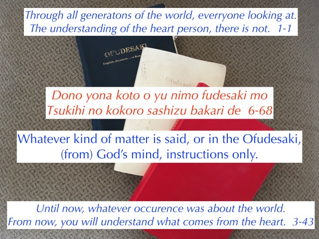 God is telling us that whatever is written in the Ofudesaki, or said through Oyasama is God’s instructions to purify our hearts, and save the world.
