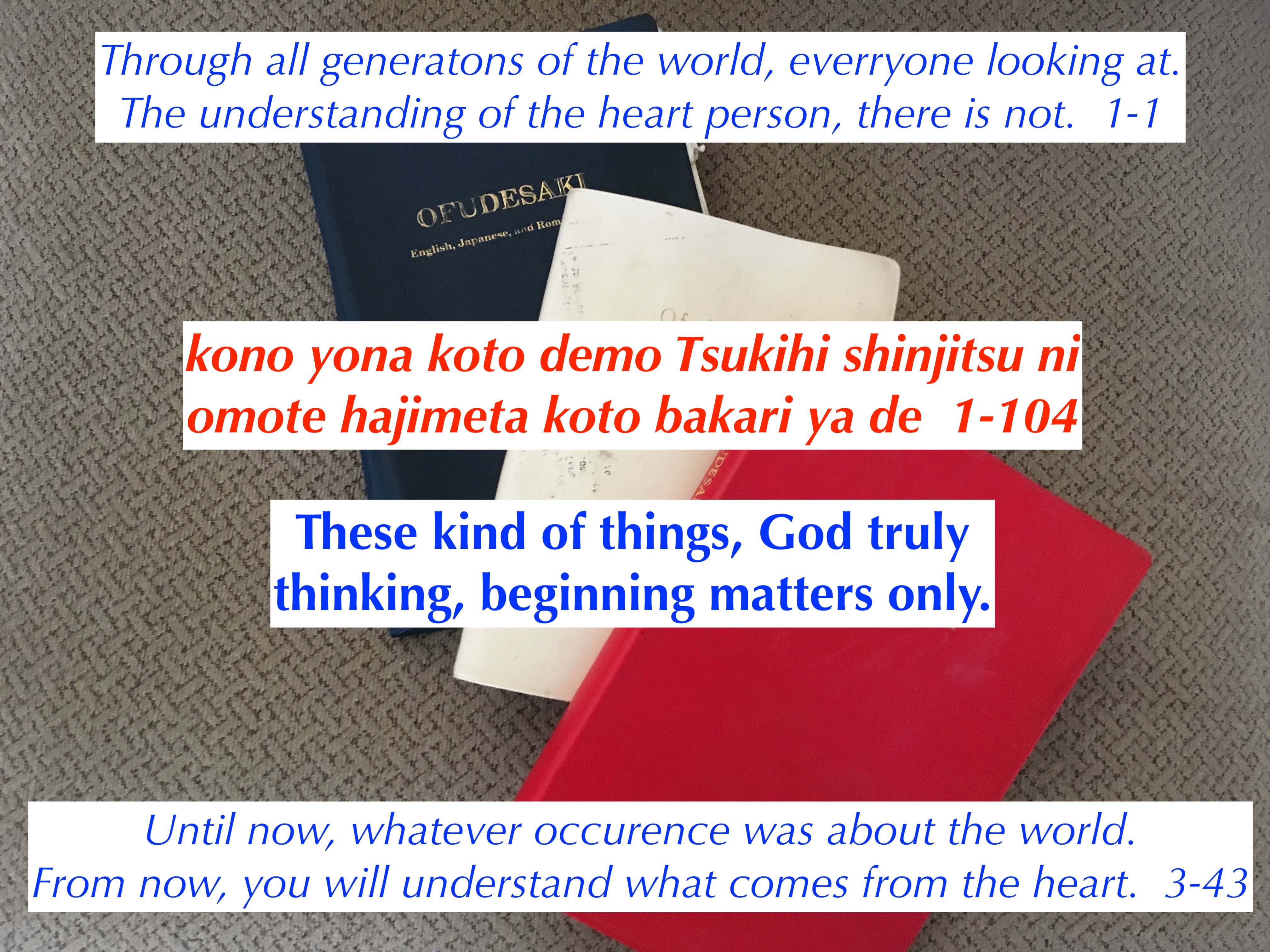 God is telling us that the beginning of the world took much effort and thought. In the Ofudesaki God reveals why human beings were created.
