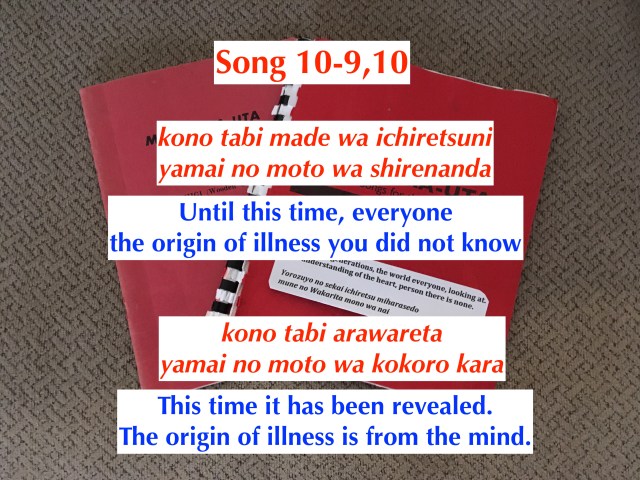 But if illness or suffering comes from the mind, by what mechanism does this work? God in the first verse of the most sacred scripture (Ofudesaki), tells us we do not understand the heart or mune. It is the heart we must first understand. God tells us that it is our own hearts that monitors our behaviors. It is not God, or any evil forces that brings upon suffering. We control our own fates. We only need to eliminate the dusts or evil thoughts of regret (oshii), covetousness (hoshii), self-love (kawaii), greed (yoku), and arrogance (komam). It is our own hearts that remind us of these dusts in our minds, by delivering these fates that were caused by acting on these same evil thoughts. This is why God tells us that illness and suffering comes from our own minds! God also tells us to ponder what fate comes from our hearts. God wants us not to blame others, but calm our own minds, and ponder the dusts in our own minds, and not act upon them. This is how we purify our minds, so our hearts will bring upon only positive fate.