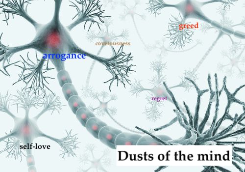 God tells us that dusts or evil thoughts have attached to their minds. These evil thoughts or dusts are regret, covetousness, self-love, greed, and arrogance. These thoughts are like viruses or bacteria that invade our minds, and spread from person to person. There is no antibiotic or medicine to remove these dusts, but God tells us in the Ofudesaki how to remove them from our minds. When these thoughts are removed from our minds, our hearts will settle and bring upon only positive fates.
