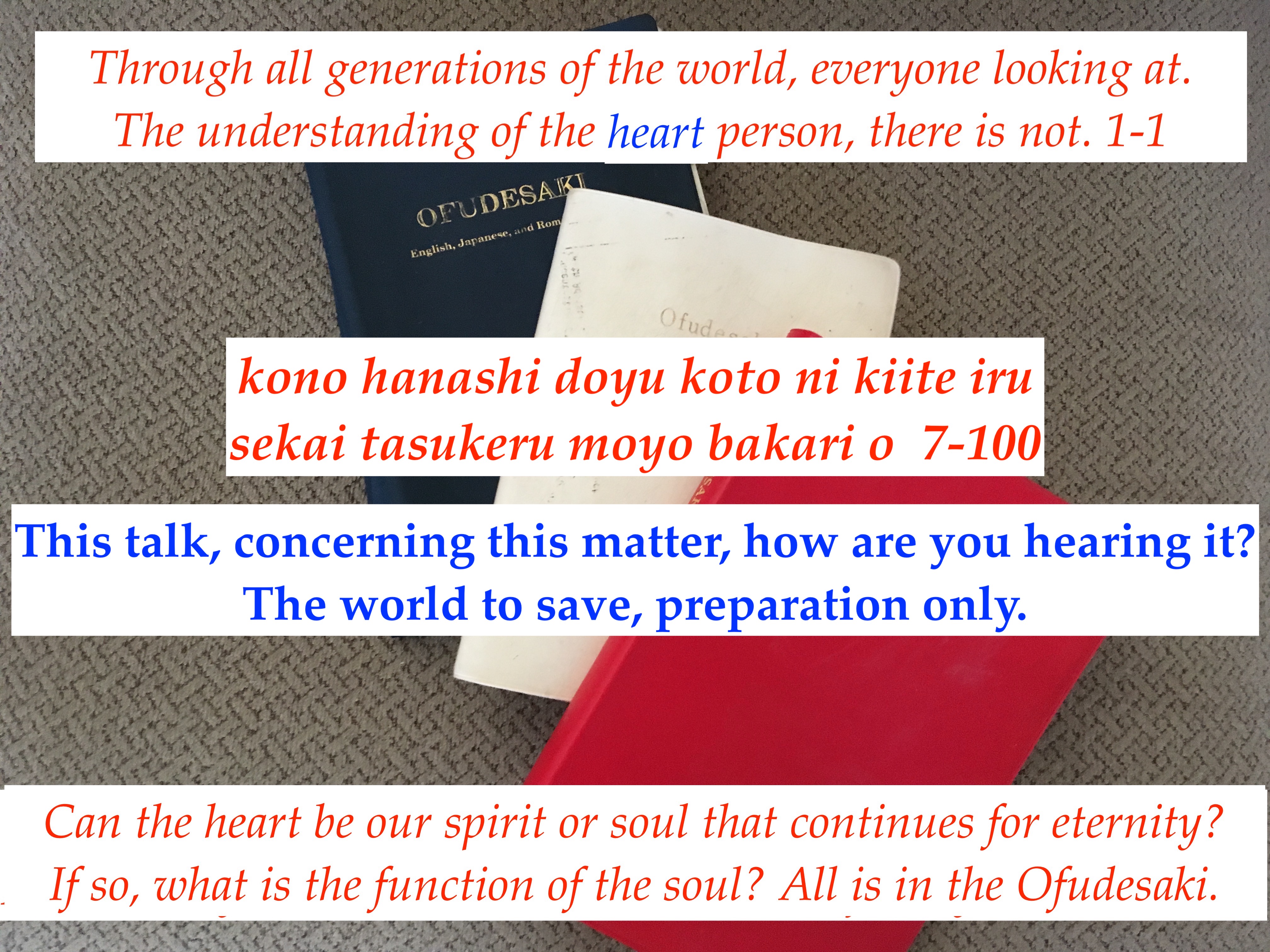 God is preparing everyone for the Service. By just performing the Service, God will not accept our prayer. We must first understand the heart to purify our own minds. Then we must spread this truth of the heart to others. When all of this is done, God tells us to perform the Joyous Service. This will then bring upon God’s salvation.