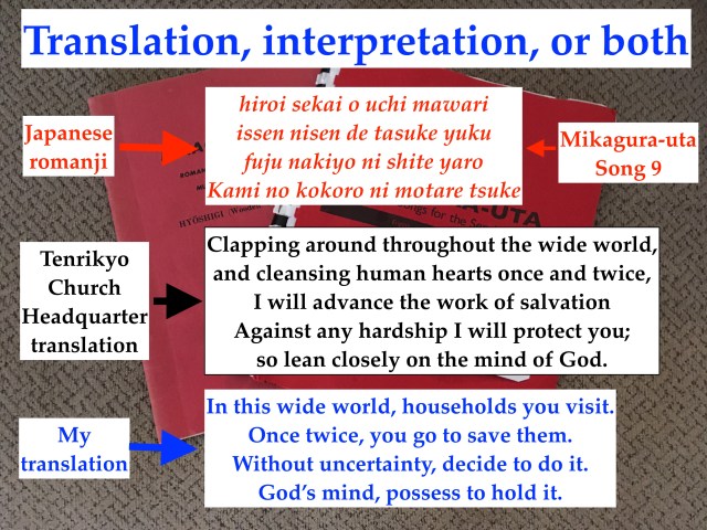 People have often told me how difficult it is to translate from Japanese to English, and that sometime we fall prey to interpretation of our sacred scriptures. For example, on the translation of Song 9 of the Mikagura-uta, there is a major difference in meaning of the two translations. Tenrikyo Church Headquarter translation insinuates that God will sweep the hearts of everyone once and twice. It also says that one should depend on God to protect one from any hardships.