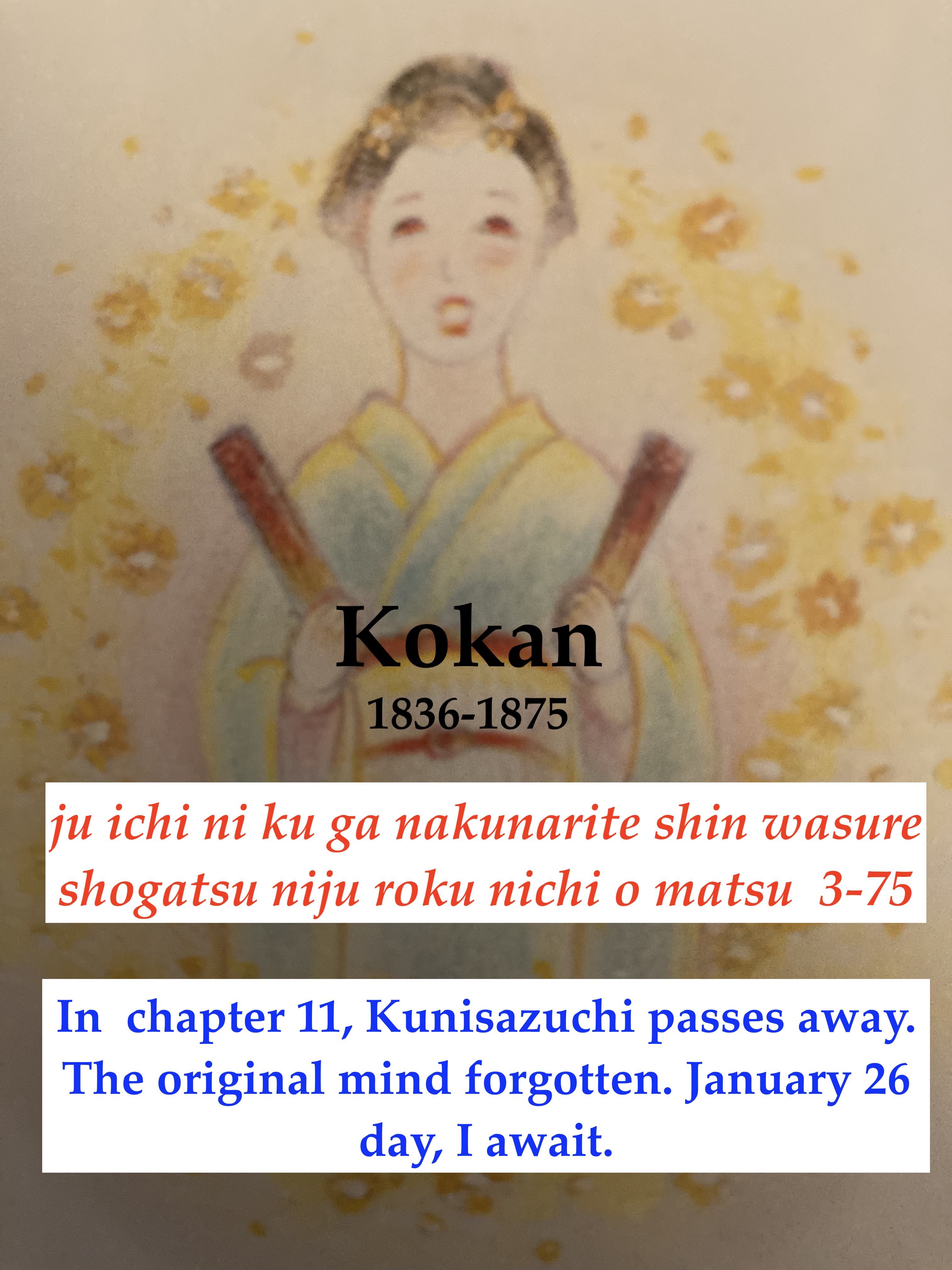 Verse 3-75 in the Ofudesaki has always been a puzzle to me. What is ku? It appears to be a number 9 as written in Japanese. But how can a number die or pass away? What is the number eleven referring to? This is my translation, and obscure interpretation of this verse. The number nine is pronounced as ku in Japanese. In the genesis of human beings, Kunisazuchi was one of the instruments used in the creation of human bodies. Can ku be an abbreviation for Kunisazuchi? We presume Kunisazuchi to have the soul of Kokan. So ku is referring to Kokan, who passes away for rebirth. So what does the number 11 stand for? In part 11, or chapter 11 of the Ofudesaki, the passing away for rebirth of Kokan is told; also why God received her soul, are fully explained.