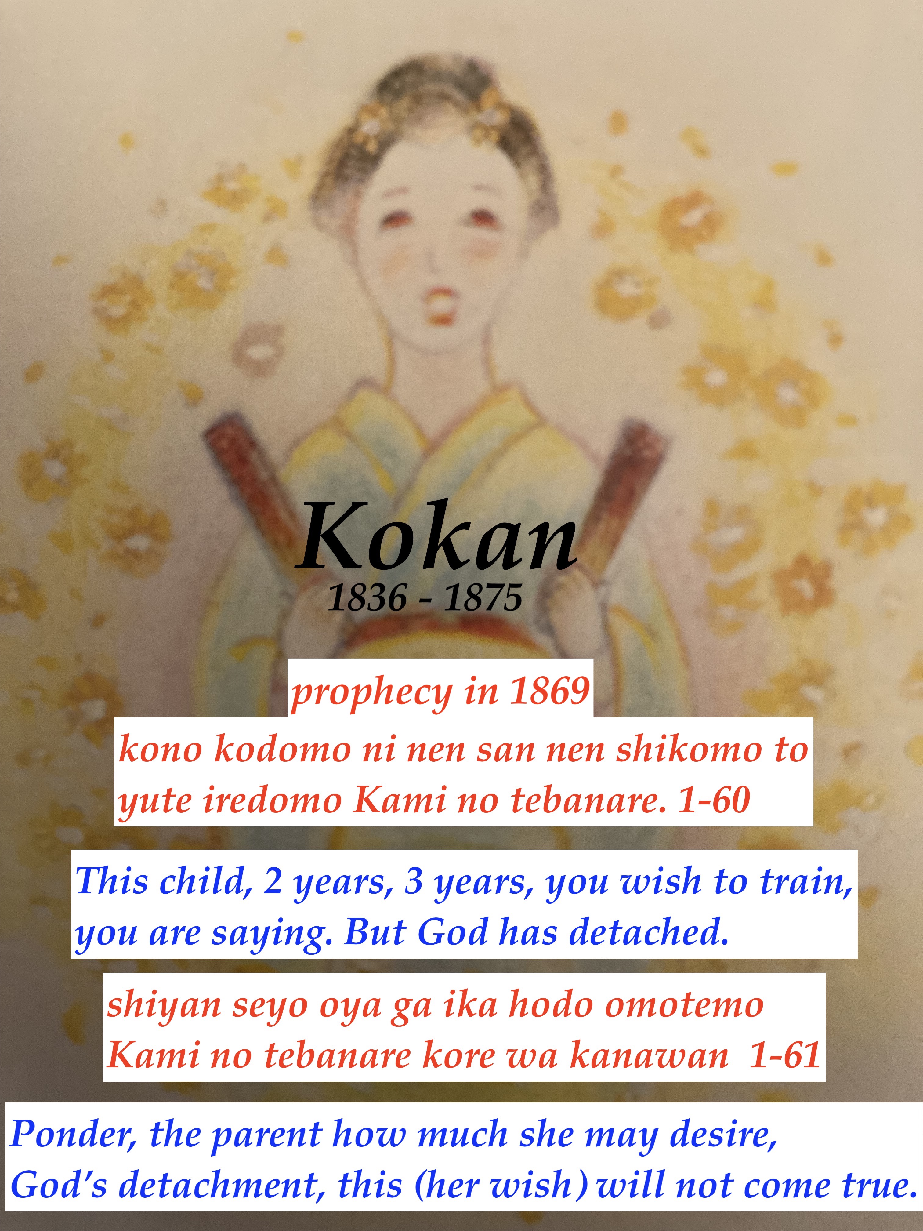 Some of you may disagree with me, but I believe that the first two chapters of the Ofudesaki summarize all the teachings, and prophesy of God. I will give you a couple of examples. The first two chapters differ from the rest of the Ofudesaki in that they were both written in 1869. Chapter 3 is not written until 1874, which is a delta of about 5 years. The early two chapters predict the physical demise of Oyasama and her daughter Kokan (see image). In verse, 1-61 of the Ofudesaki, the word parent refers to Oyasama who wanted to continue to train Kokan. The following is from the Ofudesaki and the Life of Oyasama.
