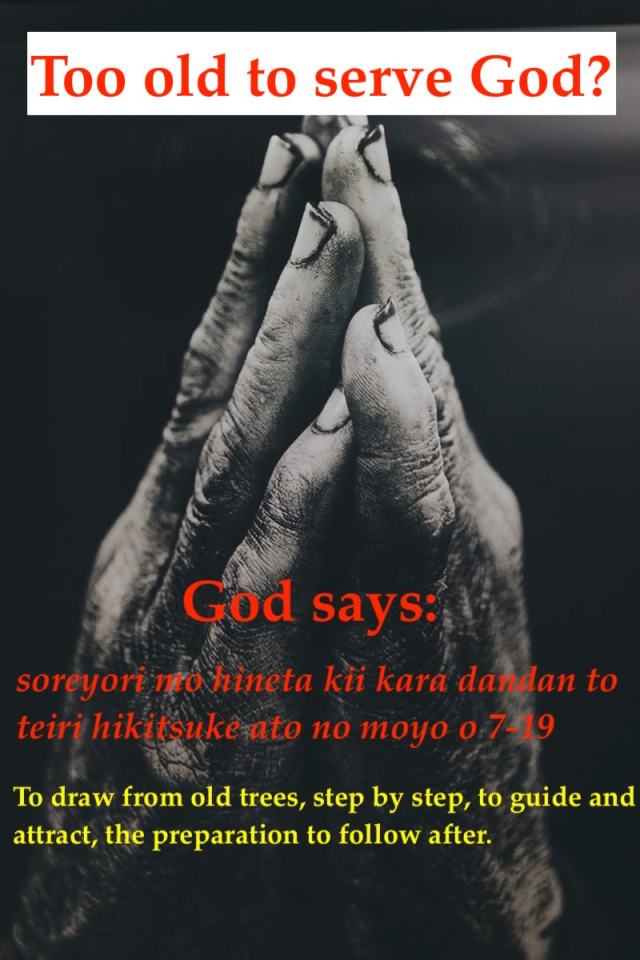 I have heard people say, “I am too old to spread God’s truth”. What does God have to say about this? In the first chapter in the Ofudesaki, is the following: