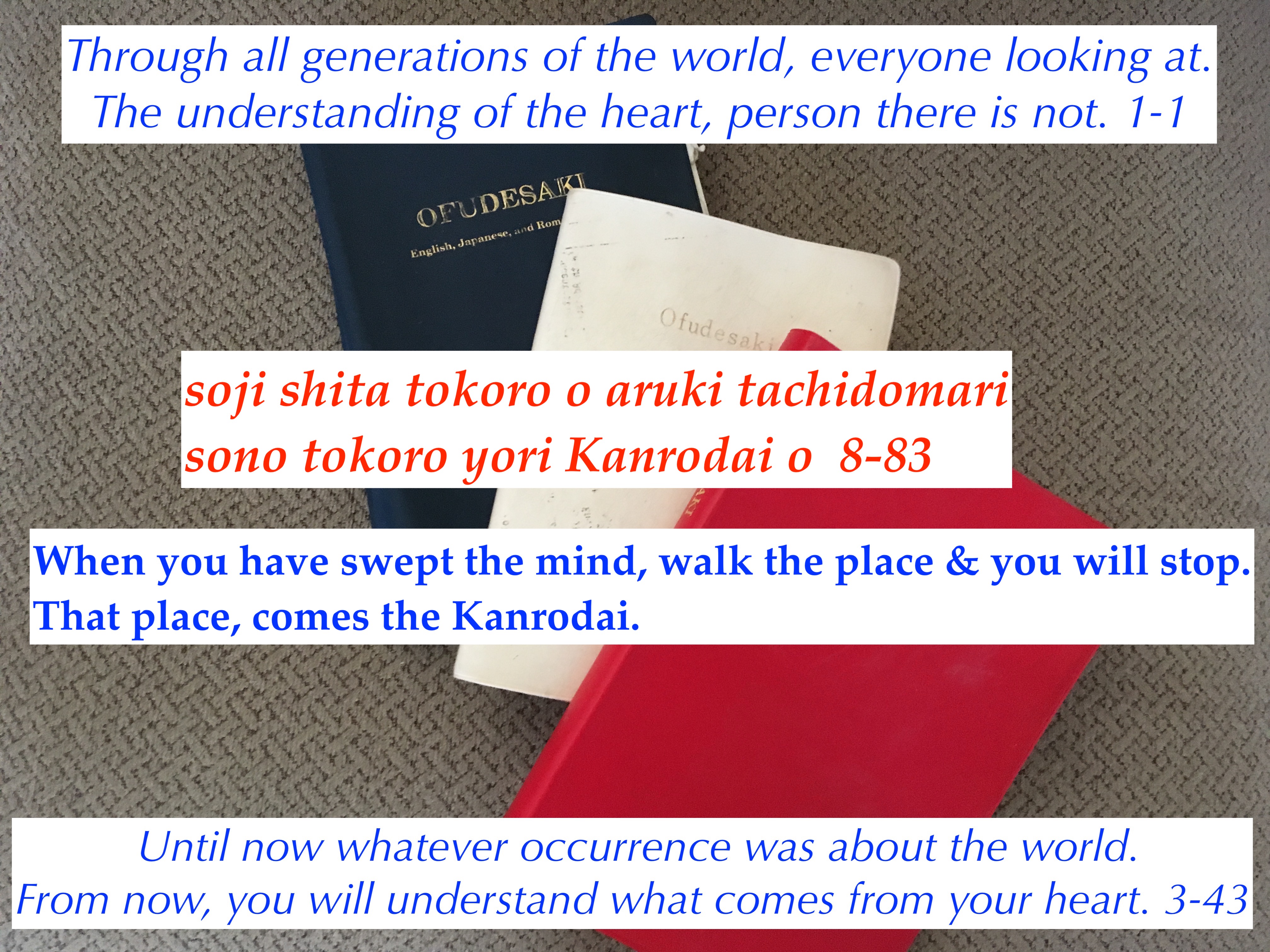This translation is different than the Church Headquarter’s English translation. The sweeping of the residence with brooms are inferred in the Headquarter translation. But from the previous verses, the sweeping of the mind is more accurate. The end result for both, is the location of the Kanrodai, or the location of the original creation.
