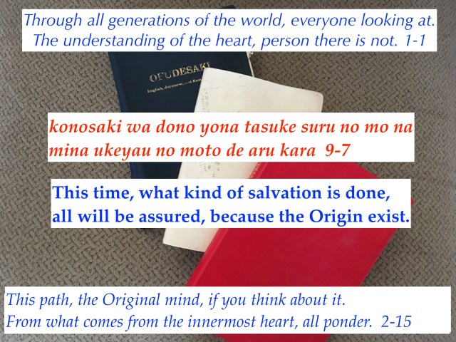 The Origin represents God who created human beings, and who placed the Original mind of God in each of the first parents of human beings. This is the God that will assure any salvation, If we attain the Original mind (shinjitsu) of the Original parents. This is a mind that has no regret, covetousness, self-love, greed, and arrogance.