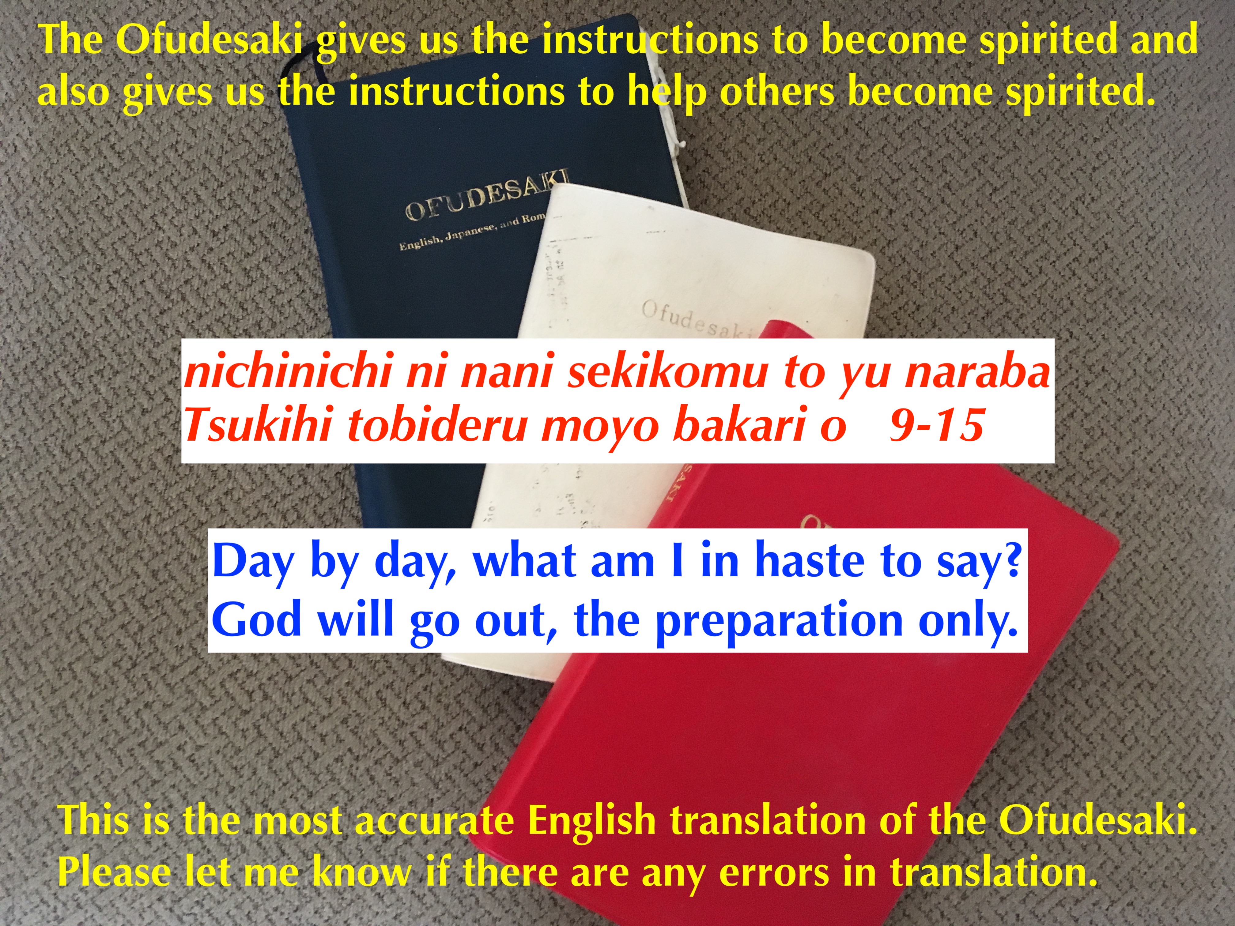 The word preparation (moyo) is very important. God will not just go out to save the world. There are prerequisites or preparations that must be done before God will go out to save others. These instructions are all in the Ofudesaki. All through the contents of the Ofudesaki, God is preparing the early followers for the sole purpose of saving the world.
