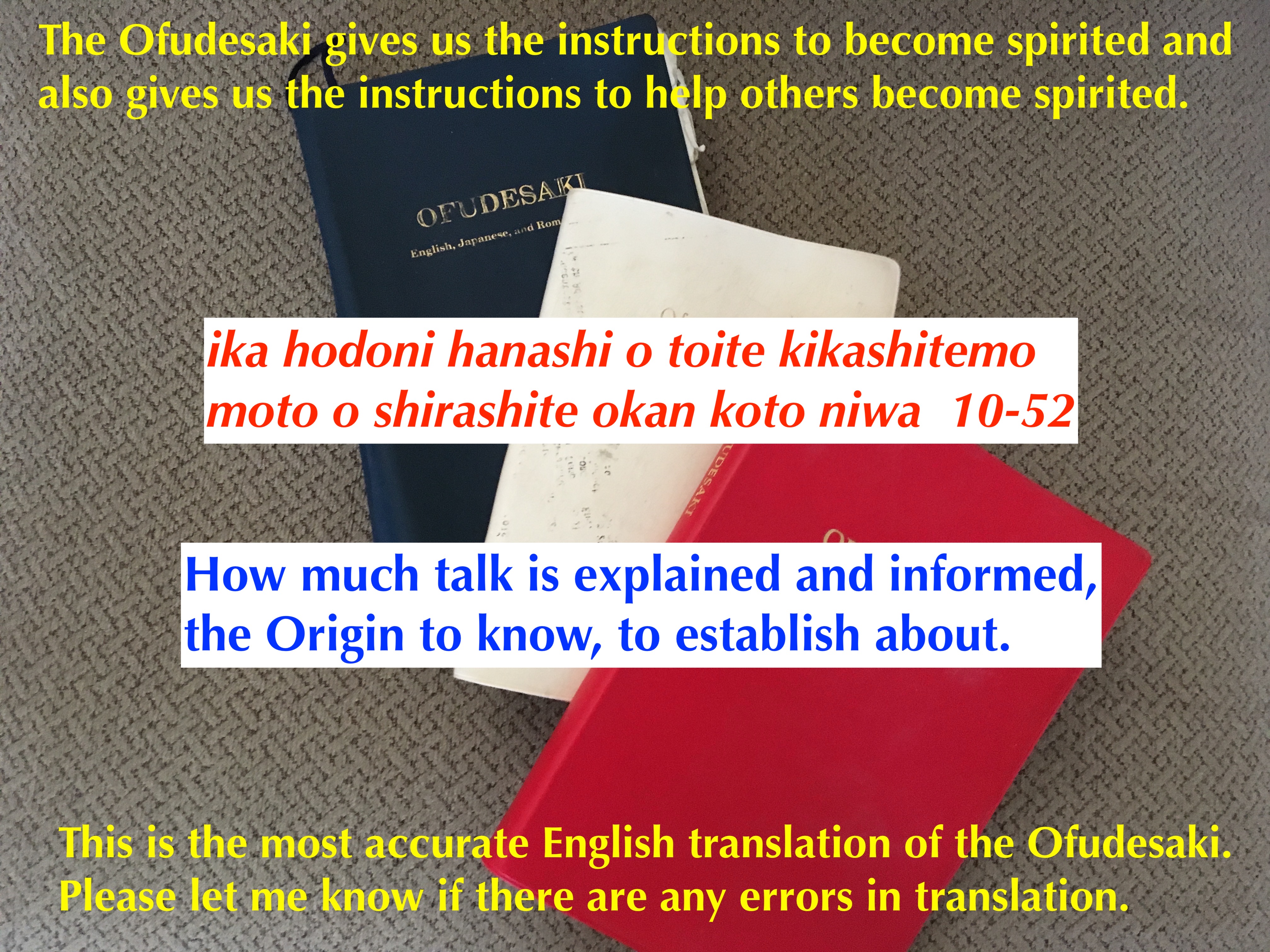 The understanding of the Origin of human beings is paramount. God created human beings to live the Joyous life. Suffering and obstacles should not exist. When we understand this, we can understand the instructions in the Ofudesaki.