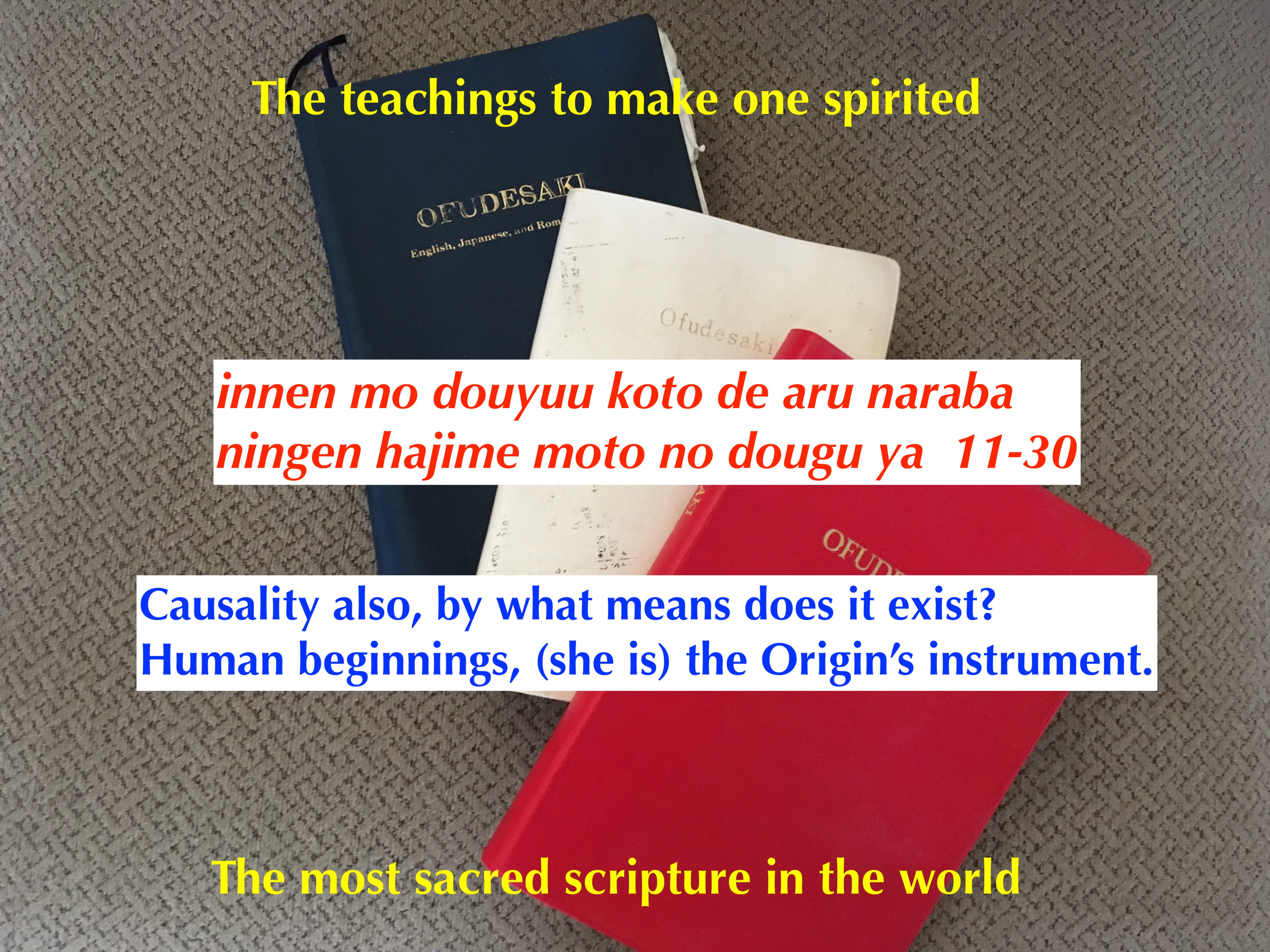 I always thought the Causality of the Origin was that God created humans to live the Joyous life. But in this instance God is talking about Kokan, the daughter of Oyasama, who was one of the instruments (sea creatures) in the muddy ancient ocean. Qualities of her were used to create human beings.