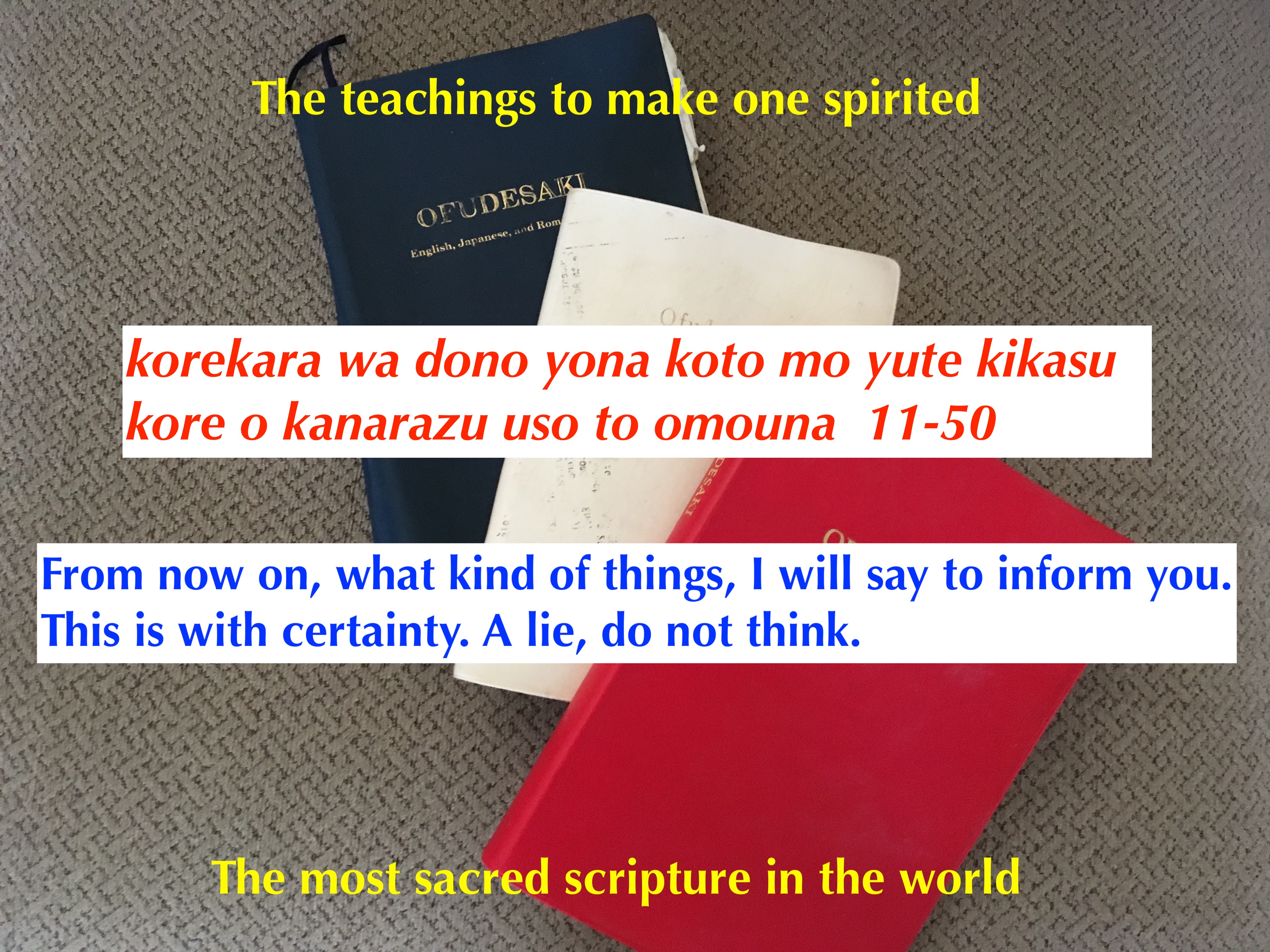Although there are many brochures and documents in our religion, and other religions, God is telling us that in the Ofudesaki, everything written is true. This is why we must study the Ofudesaki. This sacred scriptures gives us the instructions to live a “Joyous life, and also the instructions to spread these truths. Please Study these teachings.