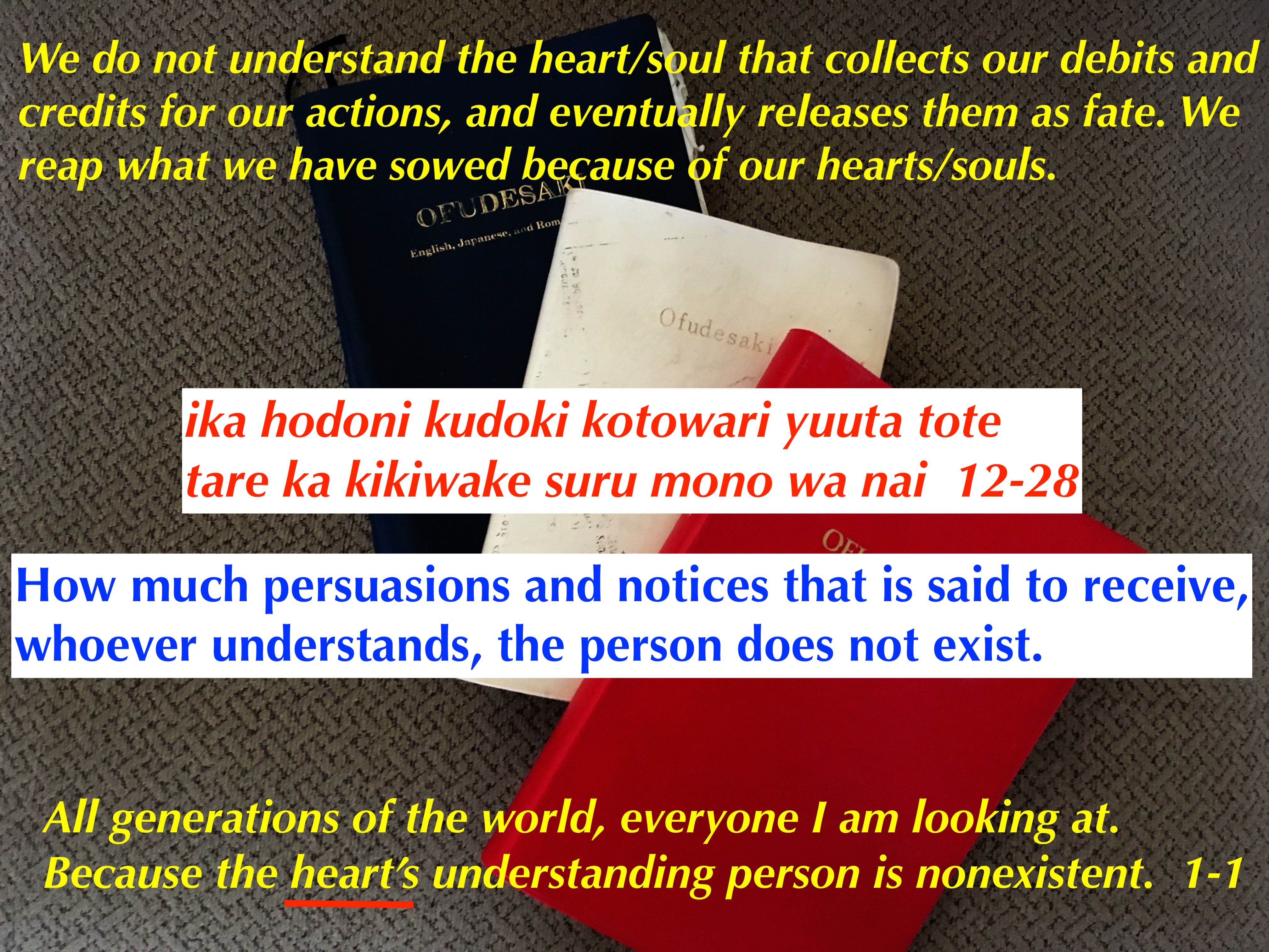 God continuously gives warnings and persuasions in the Ofudesaki. But people continue to not understand the teachings about the heart and the Original pure mind.
