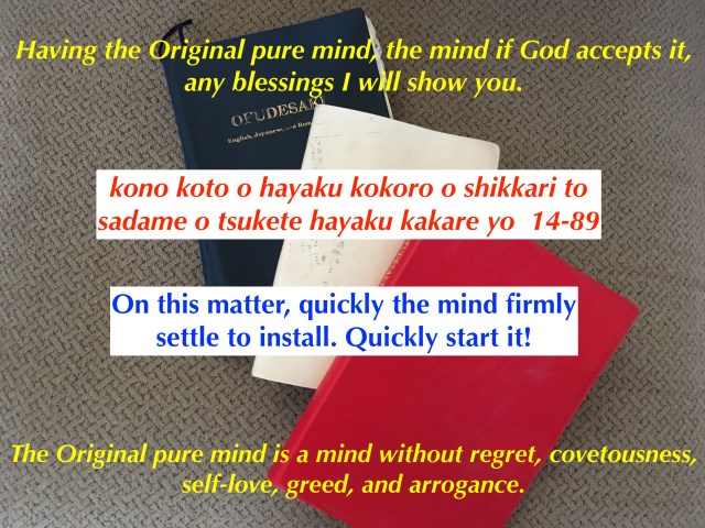 The settled mind is the Original pure mind, the mind without negative thoughts. This is the total message of the Ofudesaki. If one attains the pure mind, one will attain health and happiness! These teachings are simple, but because of our selfishness, it is a difficult path to attain the pure mind. God teaches us how to attain this pure mind in the Ofudesaki.