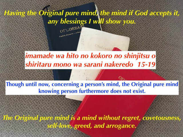 Shinjitsu or the Original pure mind is the mind God wants us to understand and attain. It is a mind without disappointment, covetousness, self-love, greed, and arrogance. This is the main message in the Ofudesaki that we are not understanding.