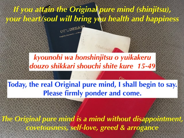 The Original pure mind, a mind without disappointment, covetousness, self-love, greed, and arrogance is what God wants us to understand, and attain. This is the main topic of the Ofudesaki. This is a mind that will bring health and happiness.