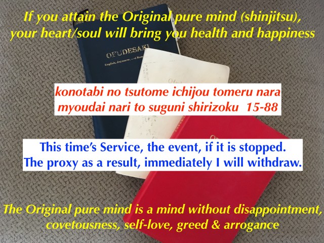 God is telling us that if the Service (Joyous Service) is not performed, God will place illness upon the members. The word shirizoku is translated as withdraw. In chapter 2 of the Ofudesaki, God’s withdraw of fire and water appears depicts illness upon the body. God is giving guidance to the performers to hasten the performance of the Service. God is telling them to purify the mind before performing the Service.