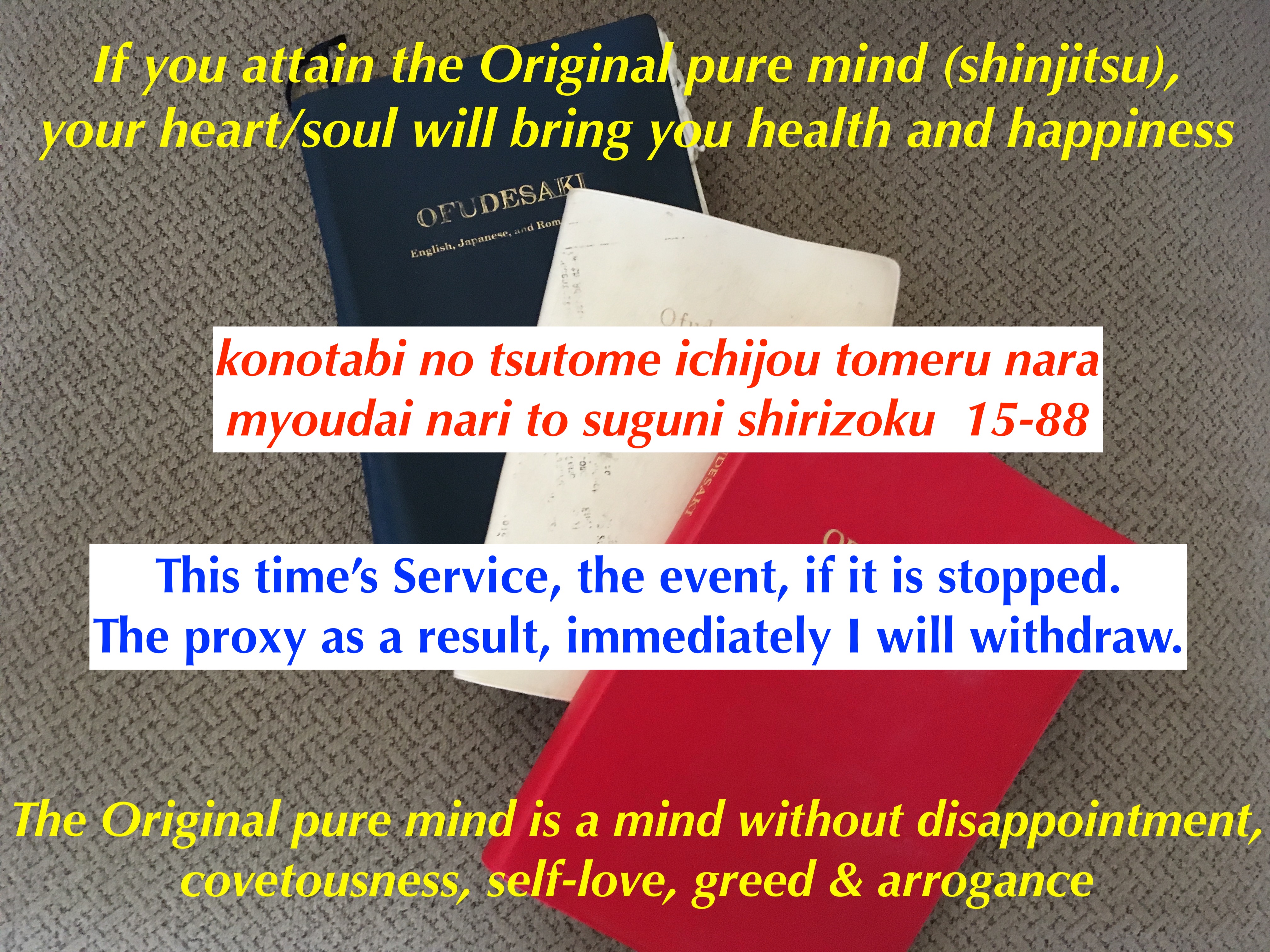 God is telling us that if the Service (Joyous Service) is not performed, God will place illness upon the members. The word shirizoku is translated as withdraw. In chapter 2 of the Ofudesaki, God’s withdraw of fire and water appears depicts illness upon the body. God is giving guidance to the performers to hasten the performance of the Service. God is telling them to purify the mind before performing the Service.
