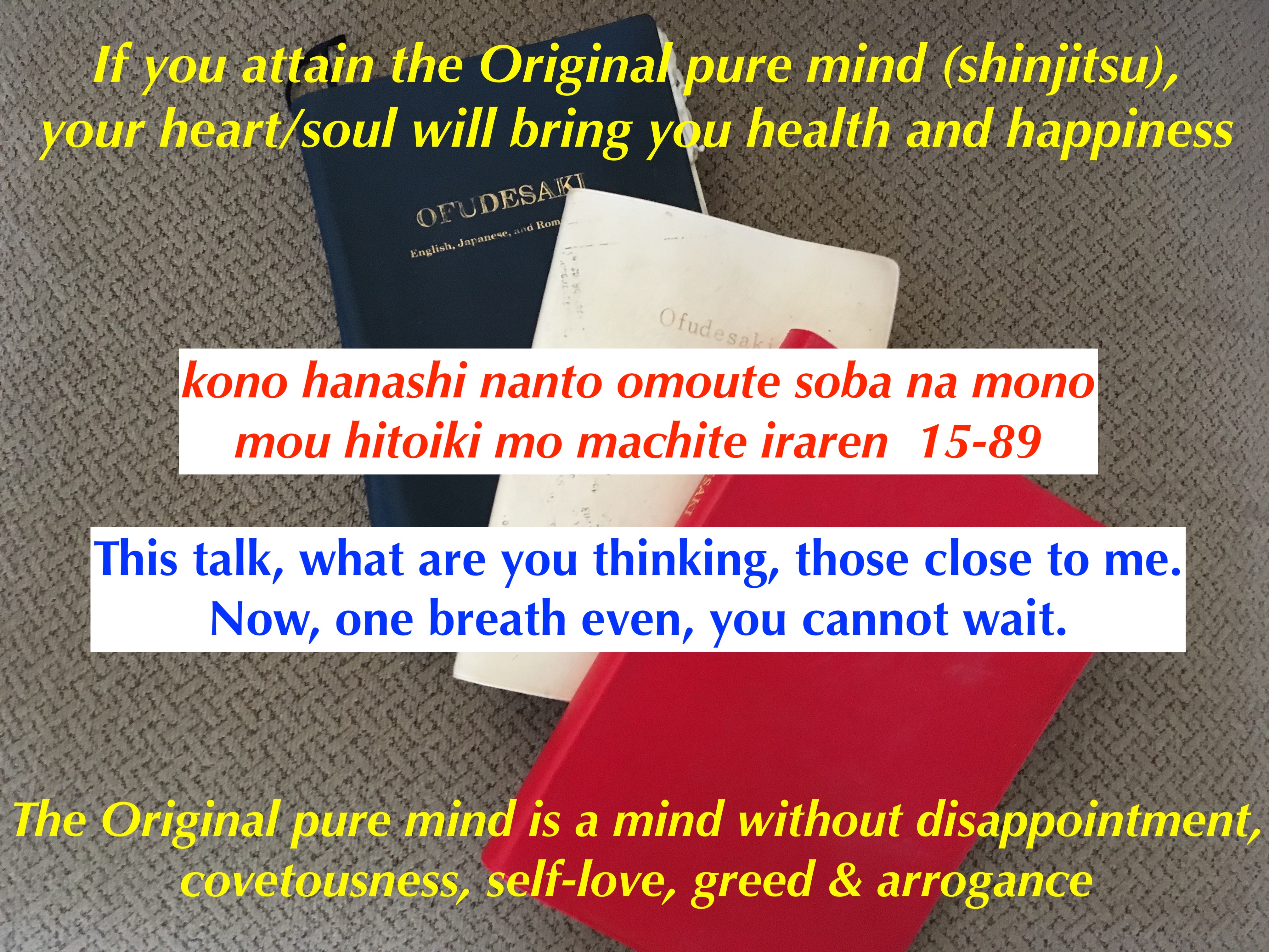 解釈:神は私たちが奉仕(youkitsutome)を行うことを望んでおられる。しかし、礼拝を行う前に私たちの心が清められるのを待っている。