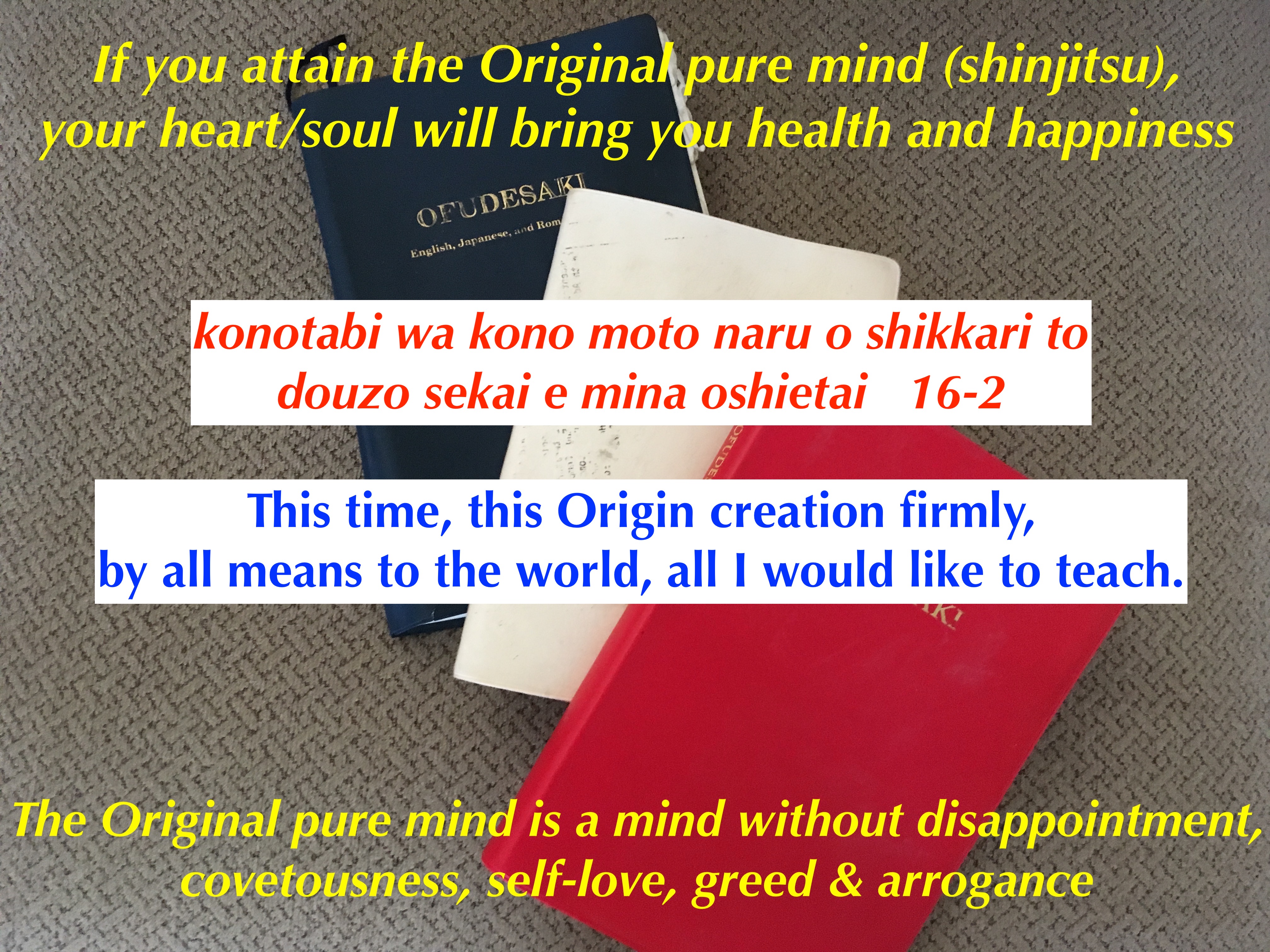 É importante entender a origem dos seres humanos porque a mente pura original do céu foi dada ao primeiro casal que deu início aos seres humanos. Essa é a mente que Deus quer que compreendamos e alcancemos. Essa mente do shinjitsu só trará saúde e felicidade.