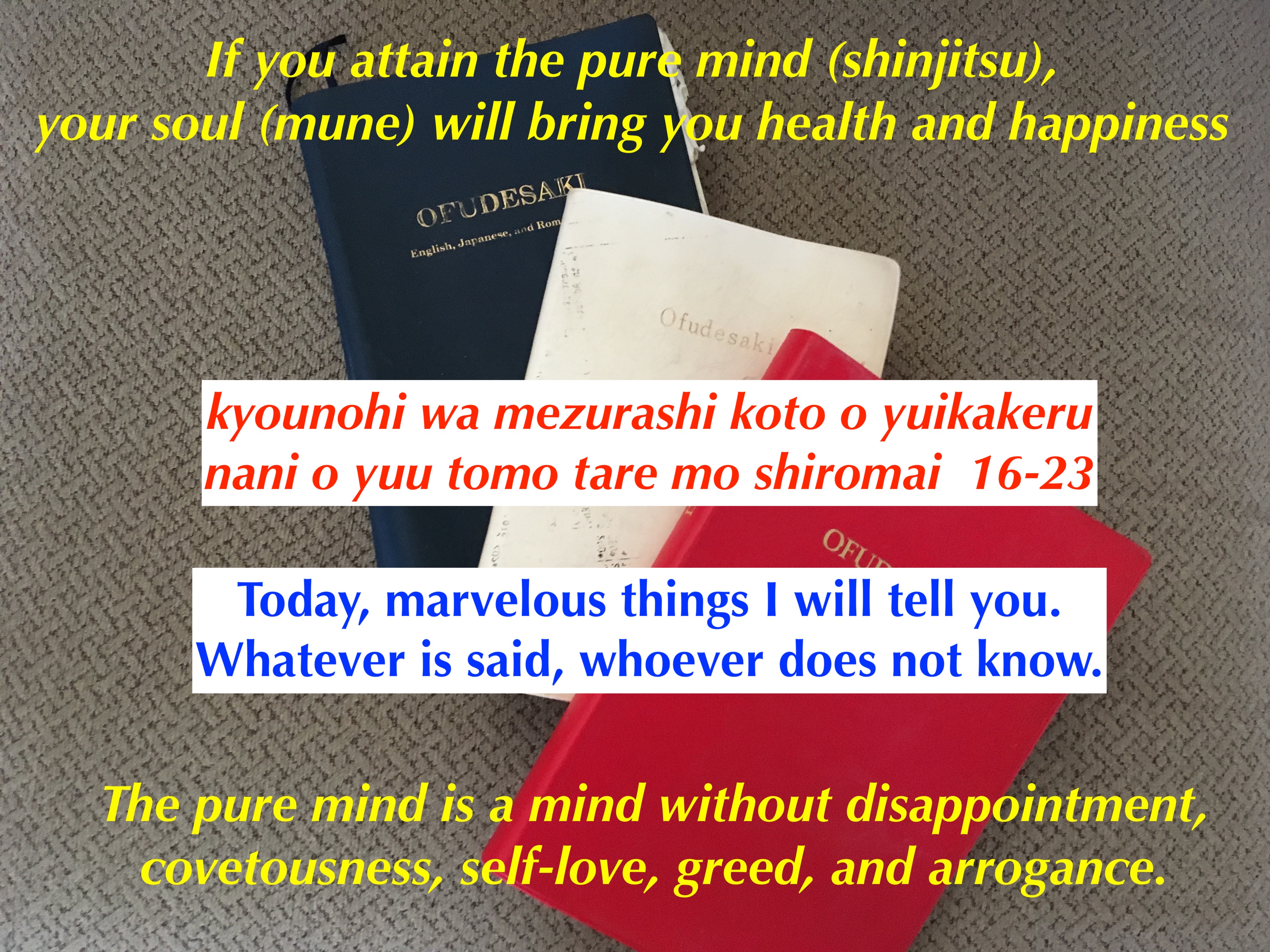 Deus falando aos primeiros seguidores sobre o que Deus começará a fazer. Primeiro, Deus fala às pessoas sobre a mente pura (shinjitsu), a alma (mune) e a orientação de Deus (よう) que ocorrerá.