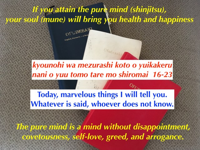 God telling the early followers about what God will begin to do. First God telling people about the pure mind (shinjitsu), the soul (mune) and God’s guidance (yo(u)) that will occur.