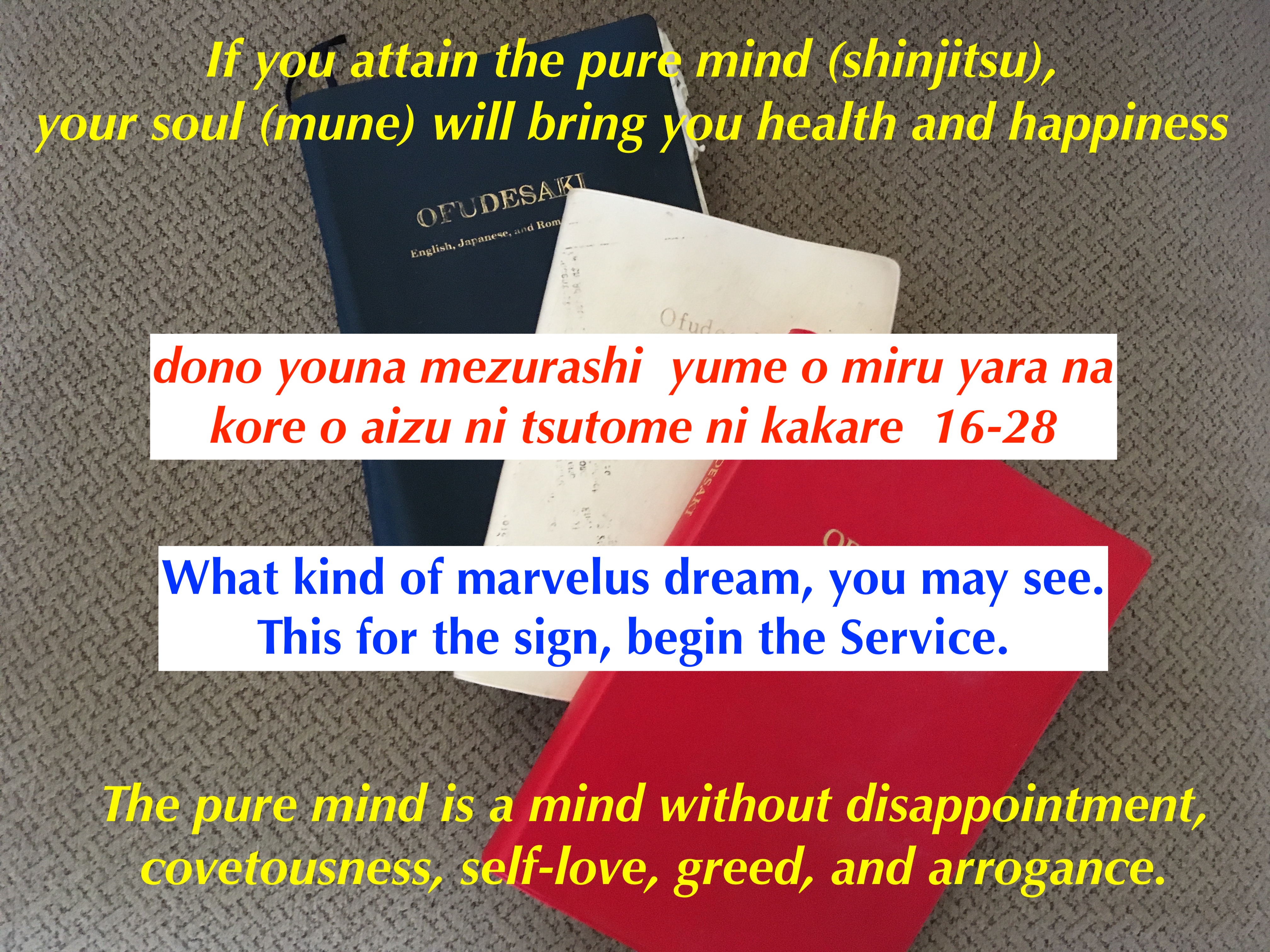 In the Ofudesaki when the word marvelous (mezurahi) is used, it talks about the spreading of God’s teachings, and what God will do to help people live a healthy and happy life. The sign (aizu) refers to God’s blessings of guidance that will appear to help one understand their own soul to purify their minds.