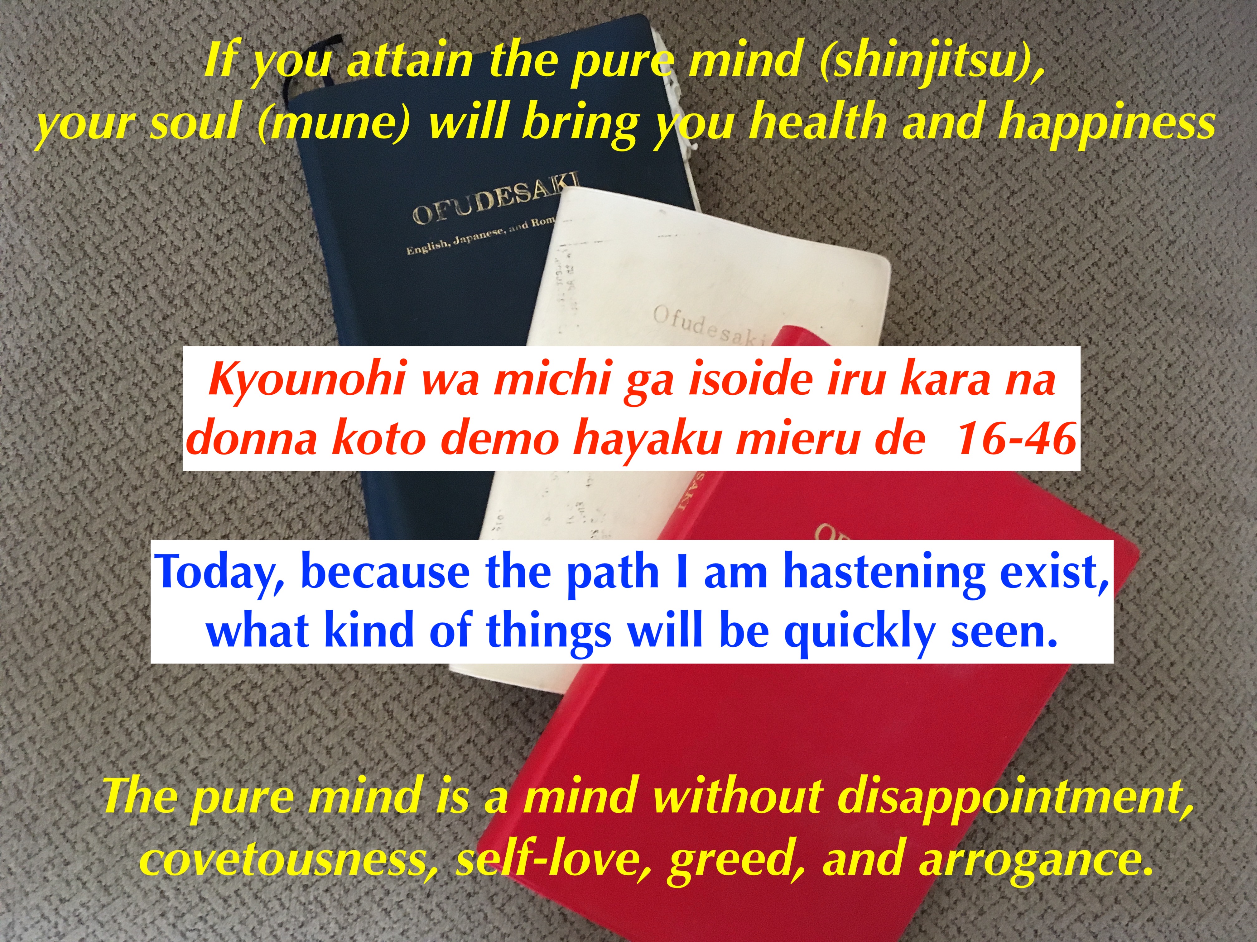 纯洁心灵的道路是存在的。上帝会开始工作,把疾病作为指引,指引那些已经了解灵魂、纯净心灵和上帝指引工作(yo(u))的人。 随着我们的祈祷(youki-tsutome)被接受,上帝将开始把疾病作为指引。