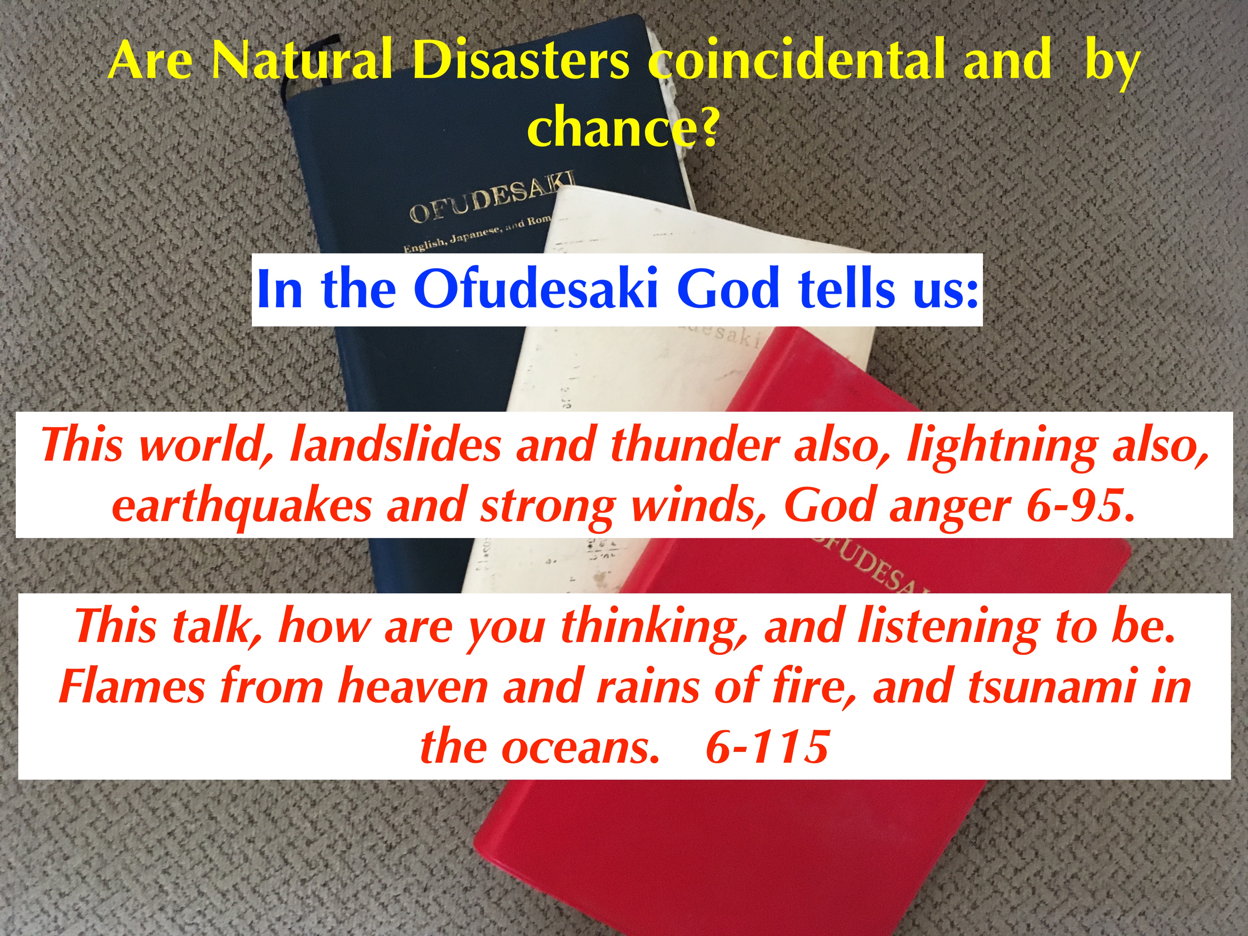 These verses tell us that events in our lives are not worldly common or accidental. Everything that appears has a reason. Who suffers from these natural disasters will depend on one’s own soul, or what fates are in their souls. This is why we who know God’s truths (Tenri) must spread these truths to the world. It is our own souls that monitor our behavior, and gives us joy or suffering. When our minds are pure (without greed and arrogance), then only joy and health will come from our souls. This is the message that the world must understand. This is why God descended from heaven to teach us. Human beings were created to live the Joyous life!. The following is from the Ofudesaki concerning natural disasters.