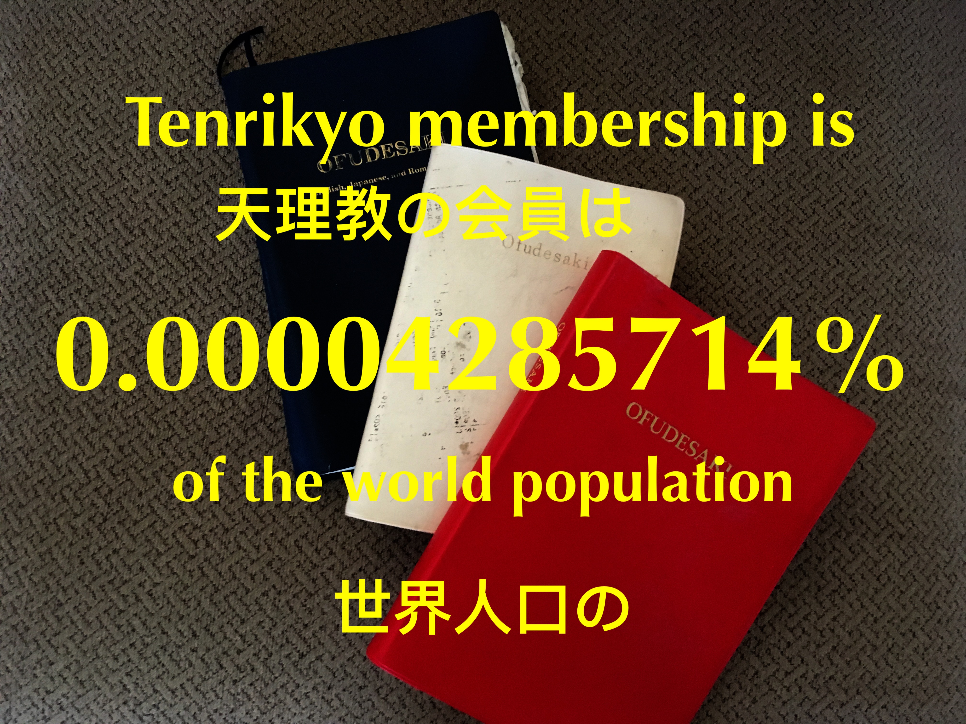 Lets say that there are 3 million Tenrikyo followers. If there are 7 billion people on earth,Tenrikyo followers total about 0.00004285% of the world population. This is almost 0%.