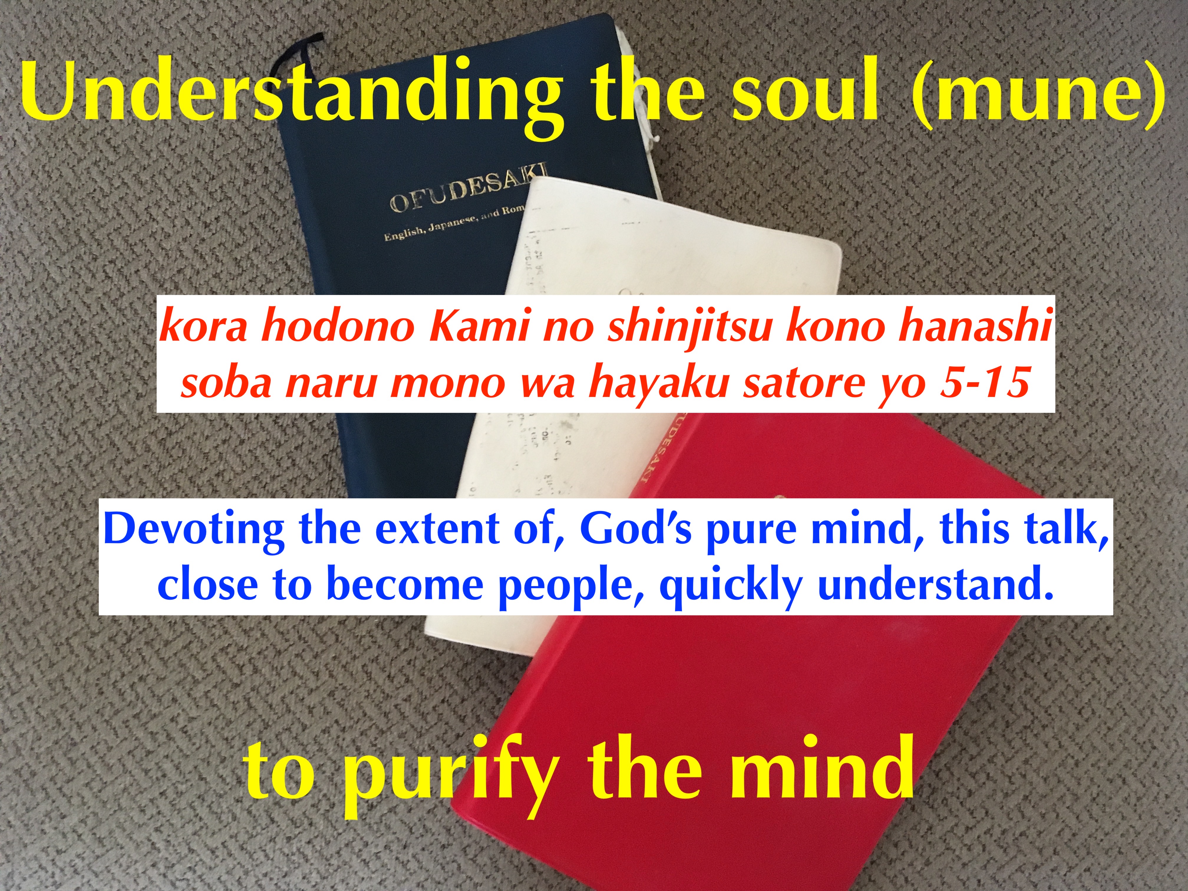 純粋な kokoro (mind)とは、後悔(おし)も、貪欲(ほしい)も、自己愛(かわいい)も、強欲(よく)も、傲慢(こうまん)もない kokoro である。これらの邪念のない心こそが救いである!自らの魂から喜びのみが湧き出るのだ
