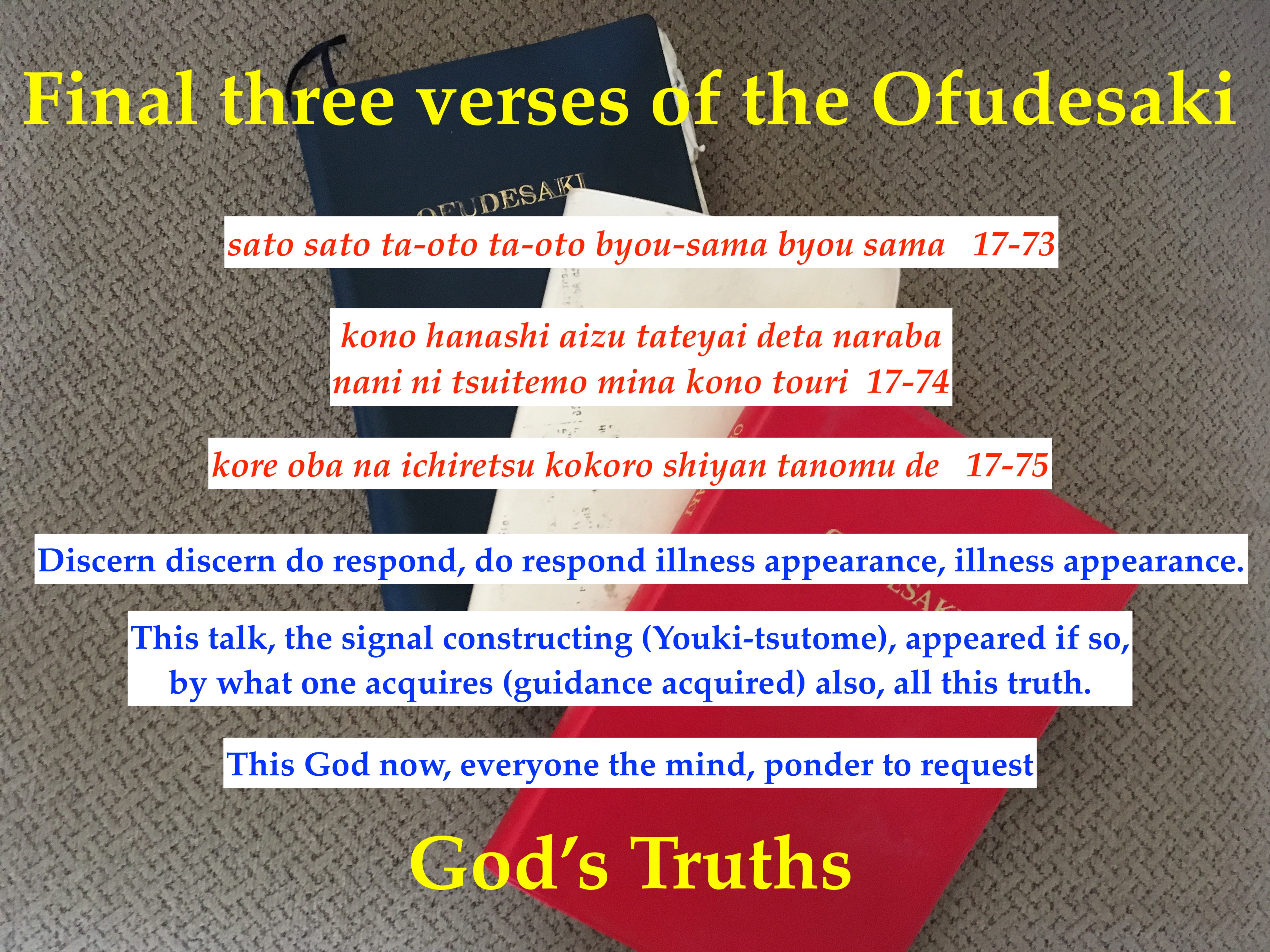 It is interesting that the final three verses of the Ofudesaki summarizes God’s truth that is in the Ofudesaki. God is telling us to look at God’s illness that appears and acknowledge it. By verse 17-74, God is telling us the Youki-tsutome initiates God’s guidance. Then in verse 17-75, God tells us to ponder God’s guidance to become convinced of the soul. Remember in the first verse God tells us we do not understand the soul.