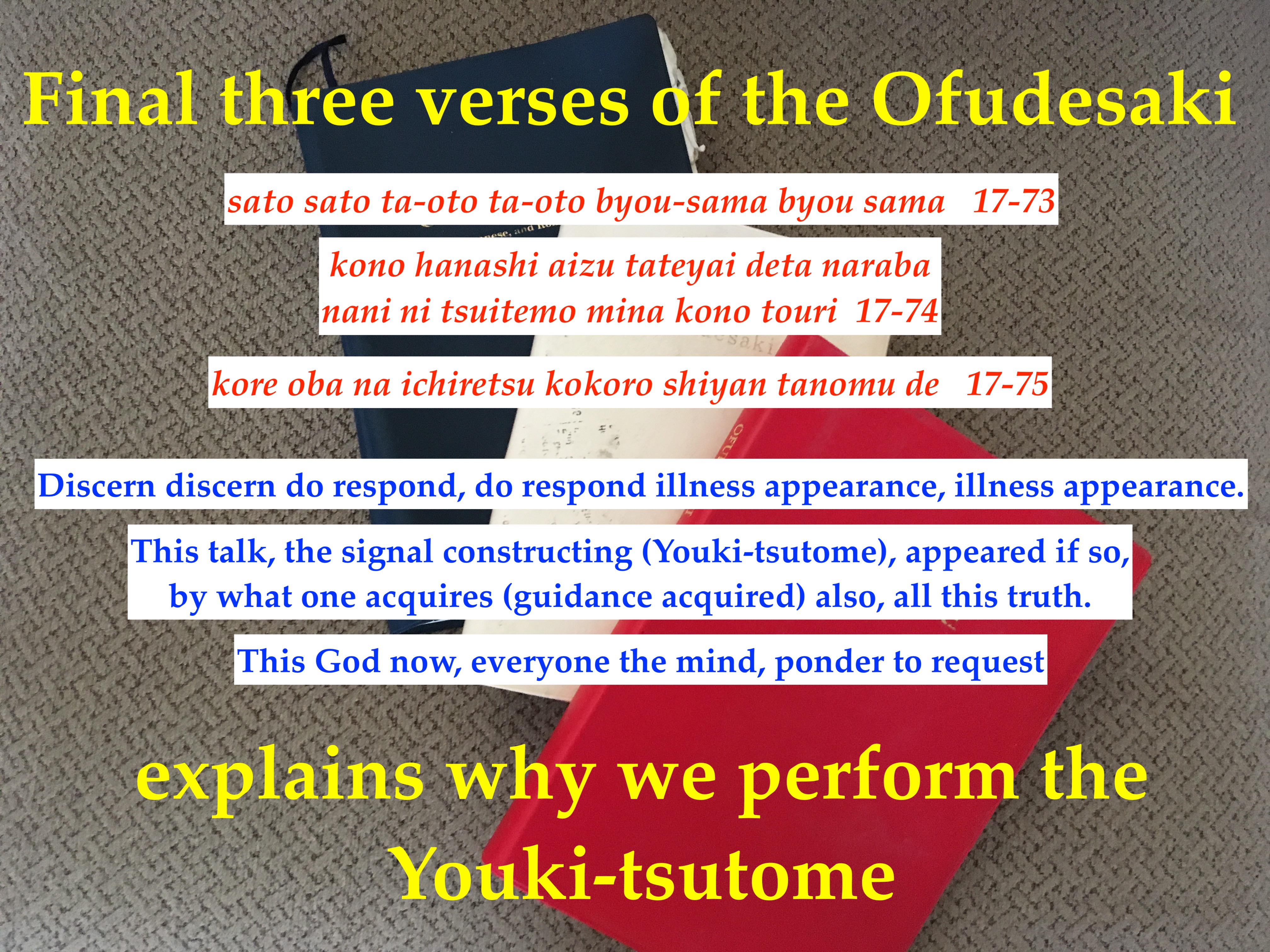In summary, the last 3 verses is a good summary of the Ofudesaki, but Church Headquarter interpretation leaves the reader to much questions, rather than answers to this sacred scripture.