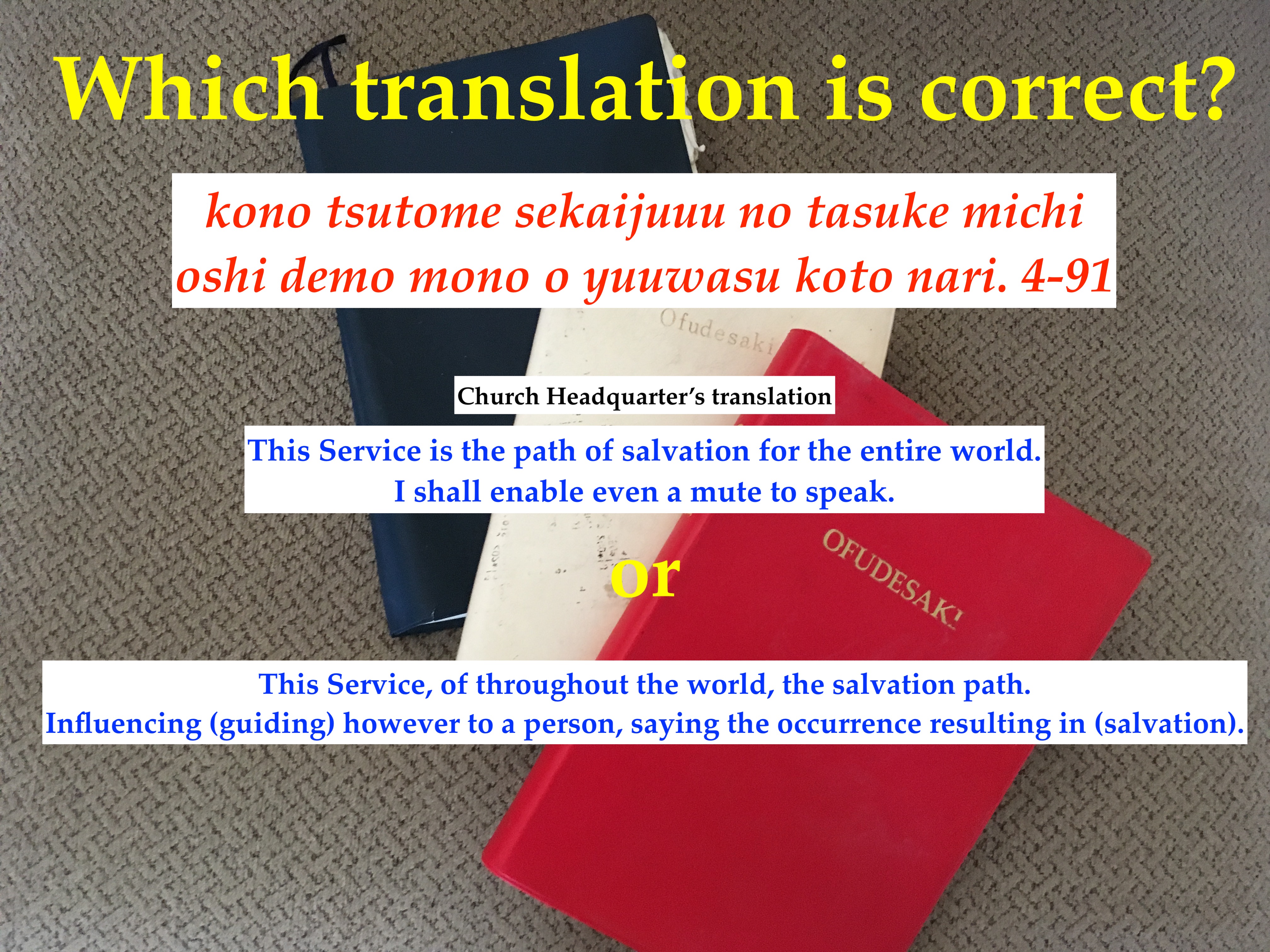 I have always wondered if verse 4-91 was translated correctly in the English translation of the Ofudesaki. The word oshi has many meanings. Of course mute is one of them, but is it the right translation? Why would the enabling of a mute person to talk God’s salvation? Is this the purpose of the Youki-tsutome to heal existing disorders? God does give us a grant to cure illness, the Osazuke. But according to the Ofudesaki, the prayer only cures illness that God has placed as guidance. So what is the purpose of the Youki-tsutome?