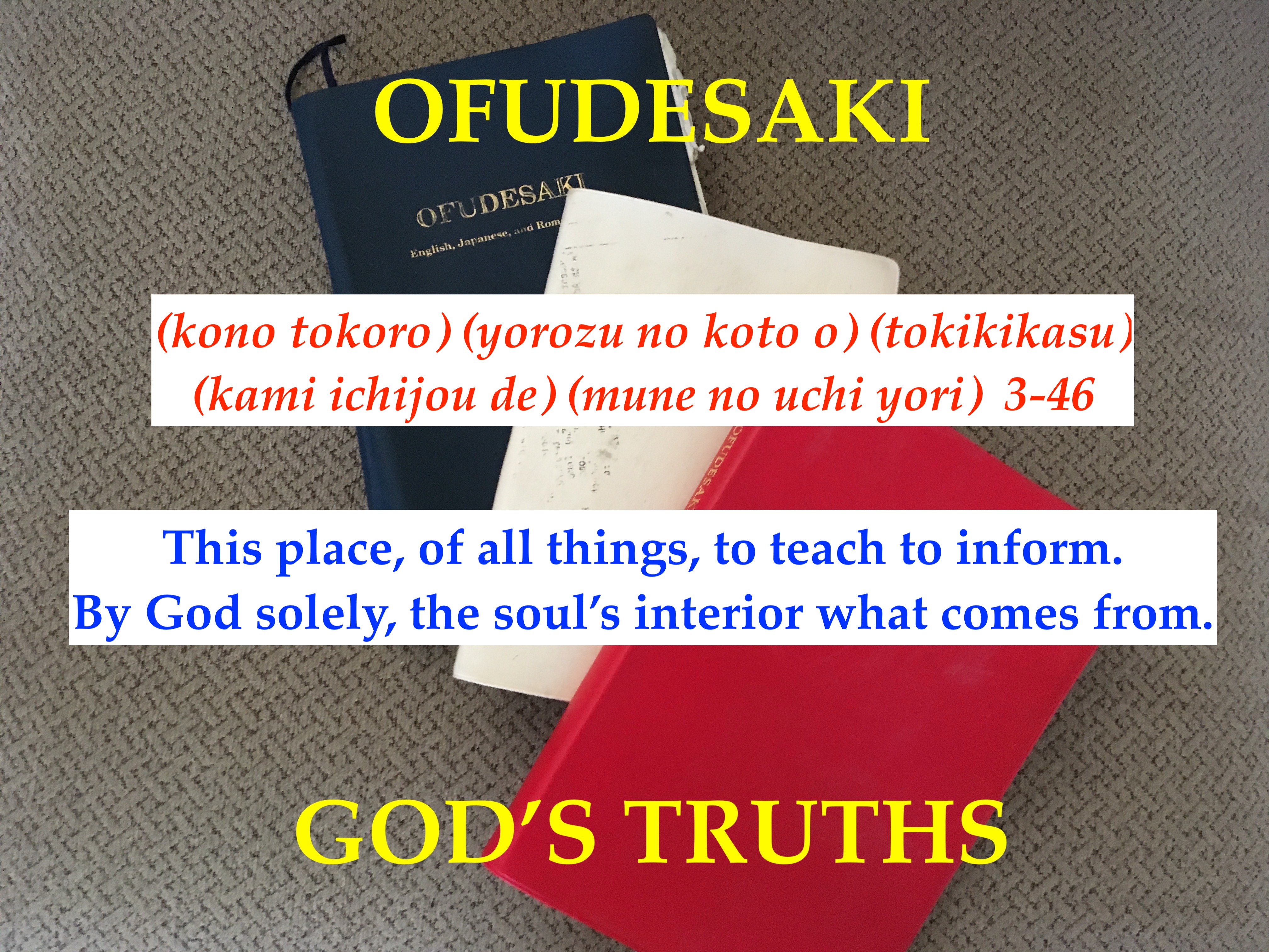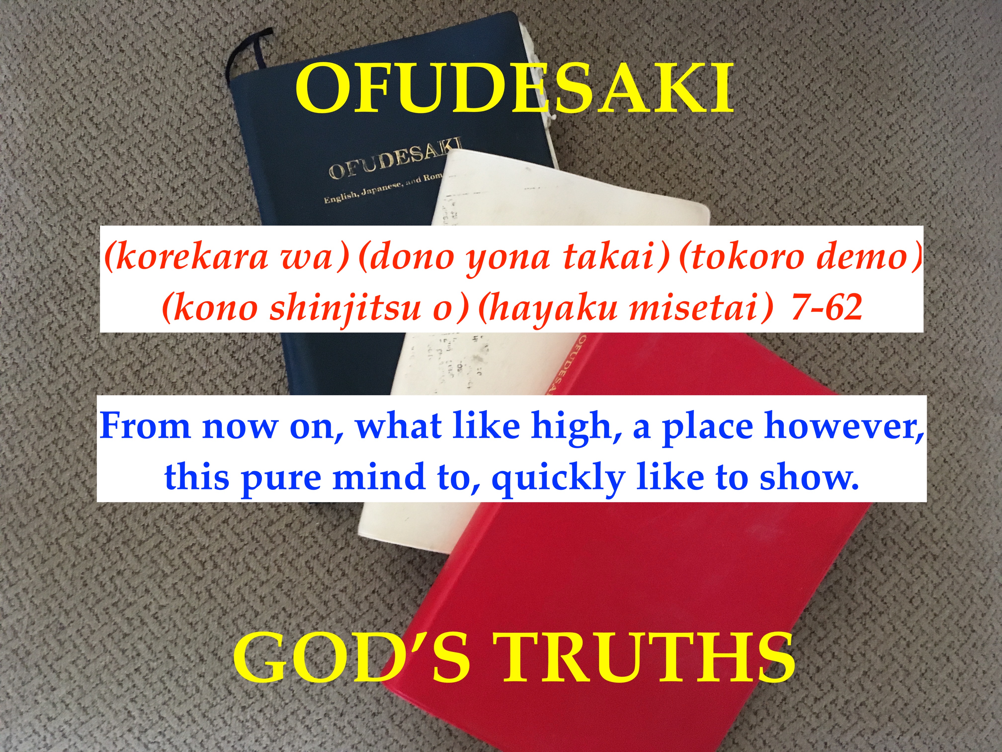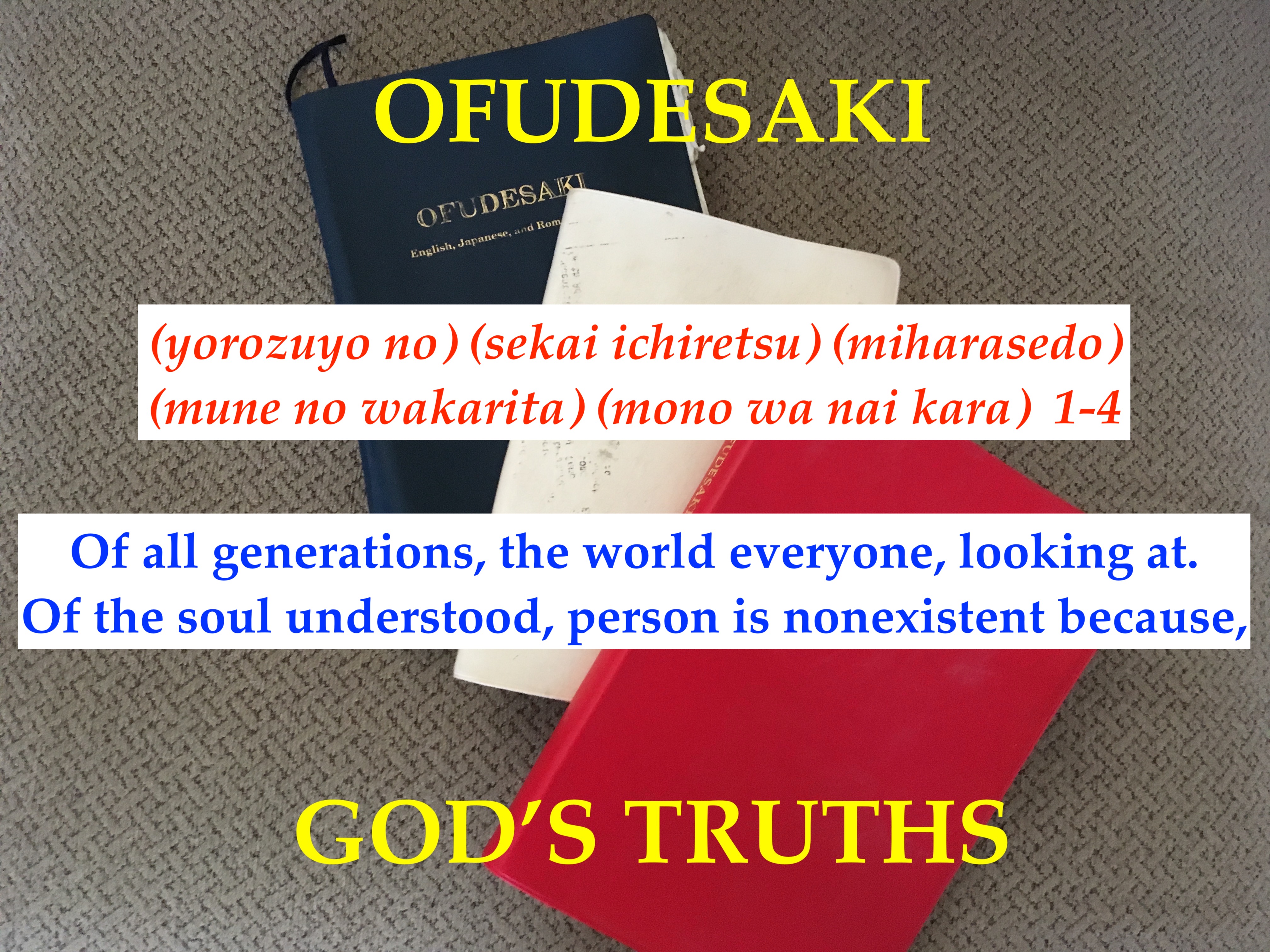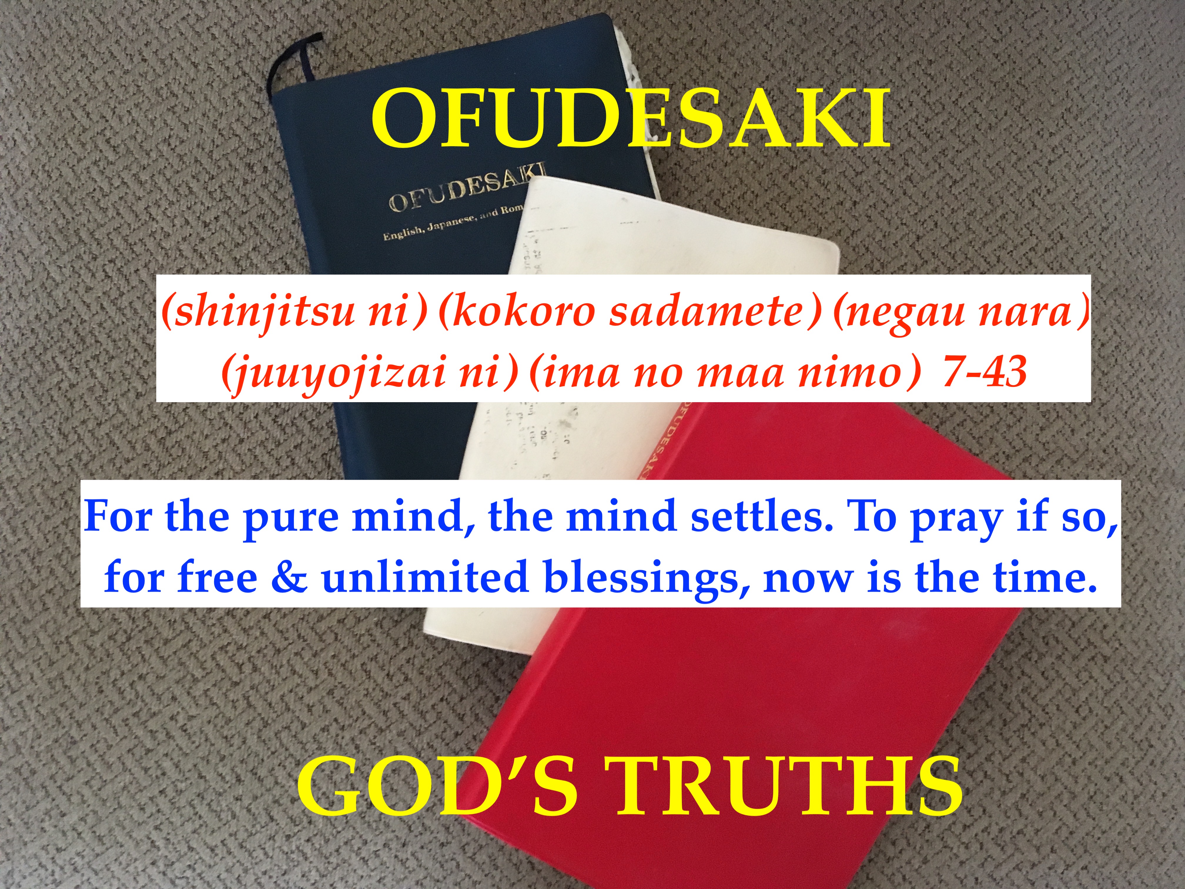 In summary, our teaching are very simple, but Church leaders have placed importance on rituals and ancient customs. I remember the Bishop telliing us that we must perform the Yorozuyo and 12 dances with perfection before God gives us blessings?? Again our prayer(Youki-tsutome) is very simple. We are asking God’s assistance in spreading the teachings to others. Please for those people that do not agree with me, do not introduce Tenrikyo scholars, and their interpretaions of the teachings, and other Tenrikyo books. I am only getting my information from the Ofudesaki, our most sacred scripture. Please give me the verse from the Ofudesaki that disagrees with my assertions. Thank you.
