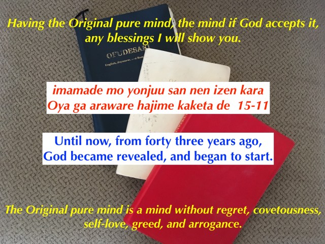 Why am I writing about this to all of you now? We as a religion are not spreading God’s truth to the world. We do not understand the teachings in the Ofudesaki, and are depending on our religious leaders to interpret the contents of the Ofudesaki. There are three main topics addressed in the Ofudesaki.