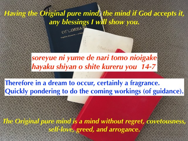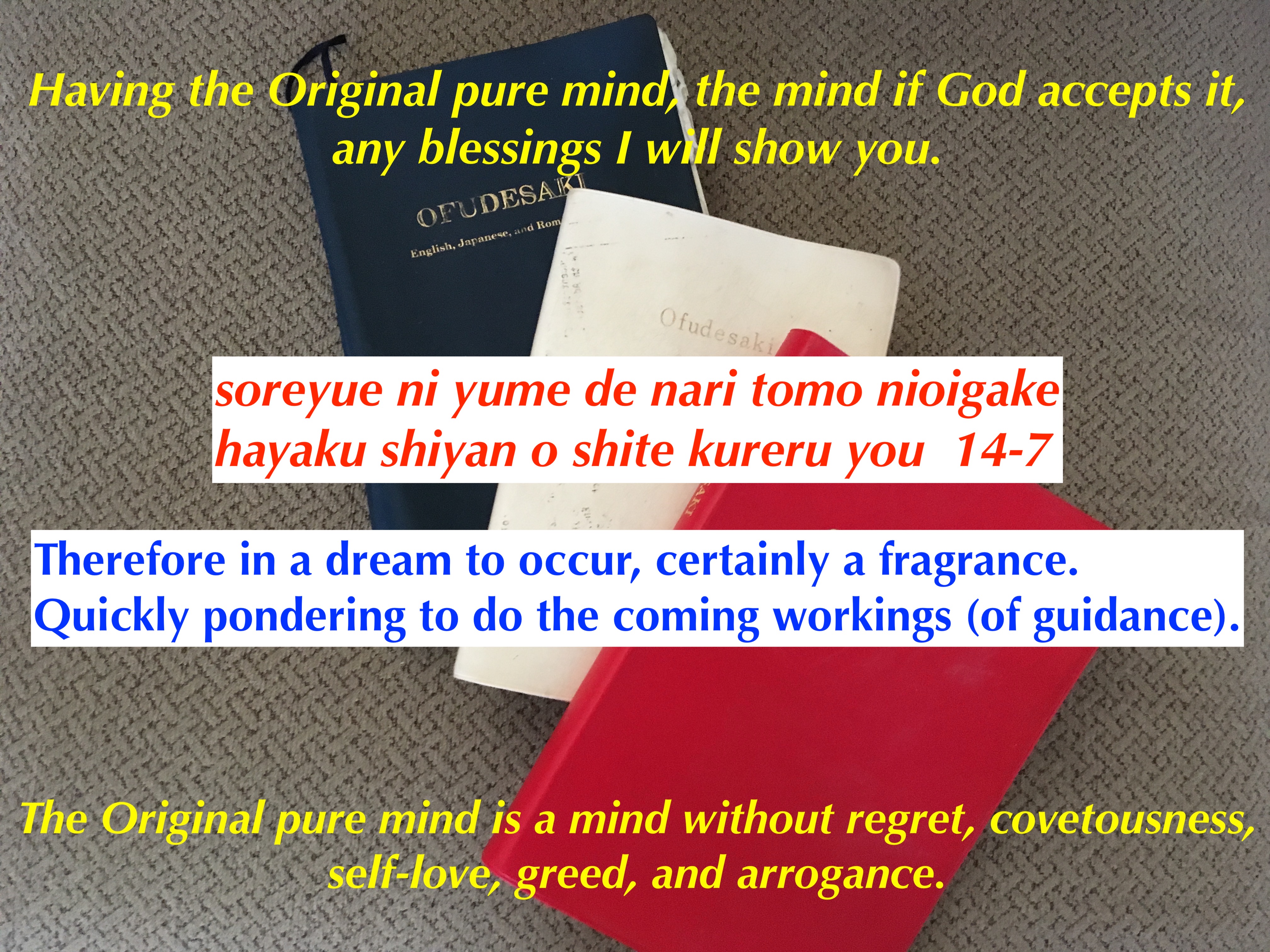 God hastens for us to obtain the Original pure mind (shinjitsu). This is a mind without disappointment, covetousness, self-love, greed, and arrogance.