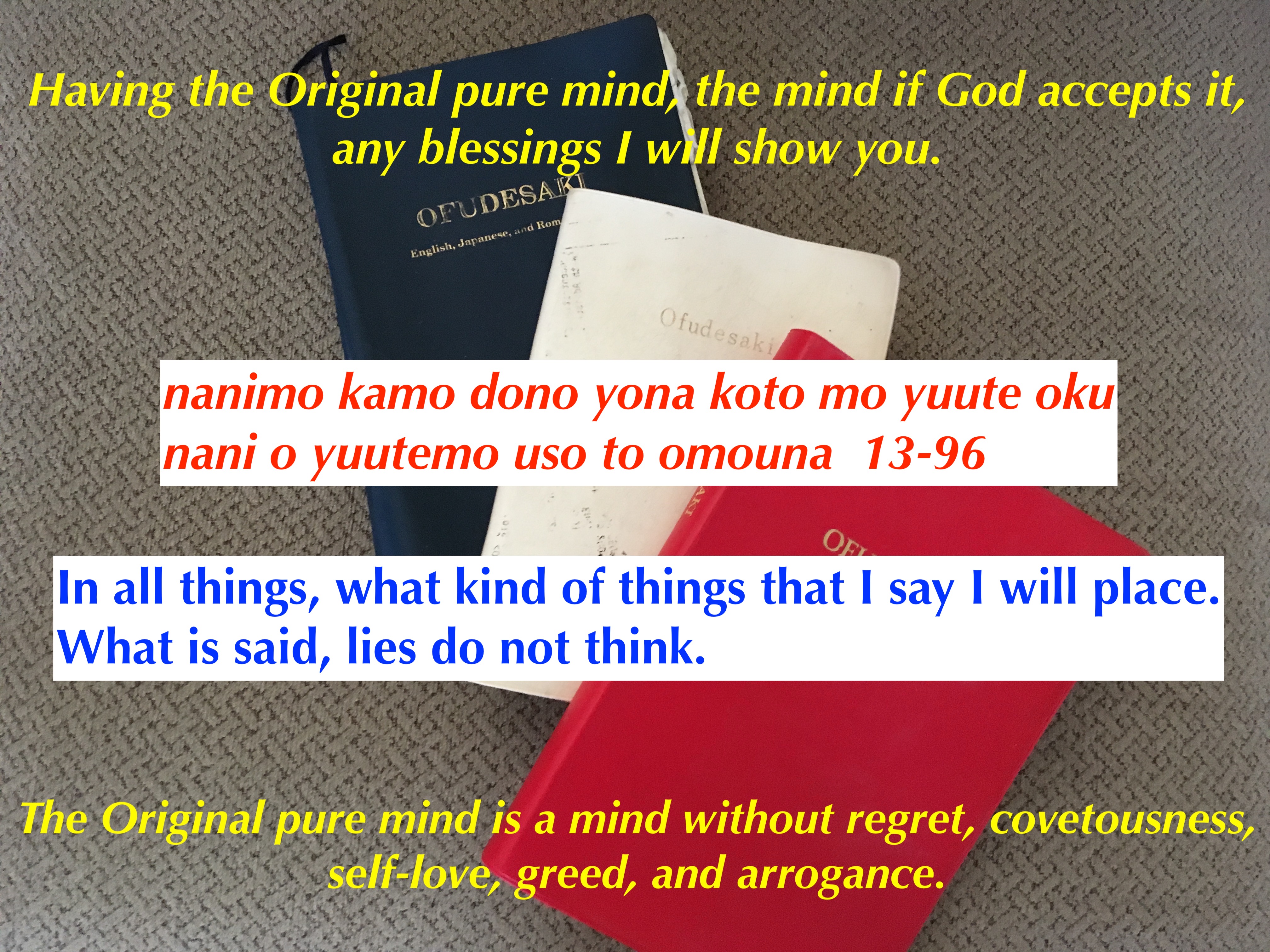 I believe we are having problems understanding both parts of the Ofudesaki. First, we do not understand the word shinjitsu, or the Original pure mind. We do not know how to attain this pure mind. God tells us only, when we attain the Original pure mind, only joy will come into our lives. God tells the early followers how to attain this Original pure mind. When the Original mind is attained, then God tells the early followers that the salvation preparation will be taught to help save others.
