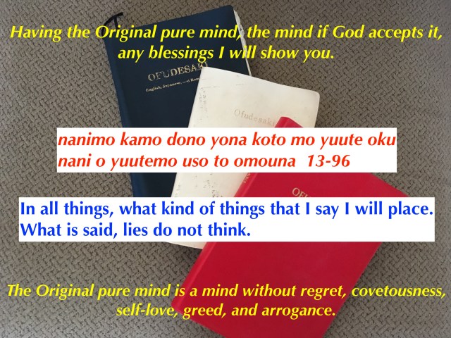 In the Ofudesaki God tells us to calm our minds, and ponder our own minds when suffering or obstacles appear. This does not mean that we should just take our sufferings in stride, and have gratitude. We should not just be resigned to say that we have committed wrongs, and should suffer all our consequences.God wants us to ponder our own minds for the evil dusts of regret, covetousness, self-love, greed, and arrogance. We should not blame others or God for any sufferings, but ponder our own minds, as these sufferings are the result of our own past actions. Then we should not act on any of our evil thoughts. This is the way we can purify our own minds. This in the Ofudesaki is called the path of the Original pure mind or the path of the heart. Don’t just accept your sufferings as karma or innen, but accept it as a way to change your mind or way of thinking. More specifically a way to purify your own mind.