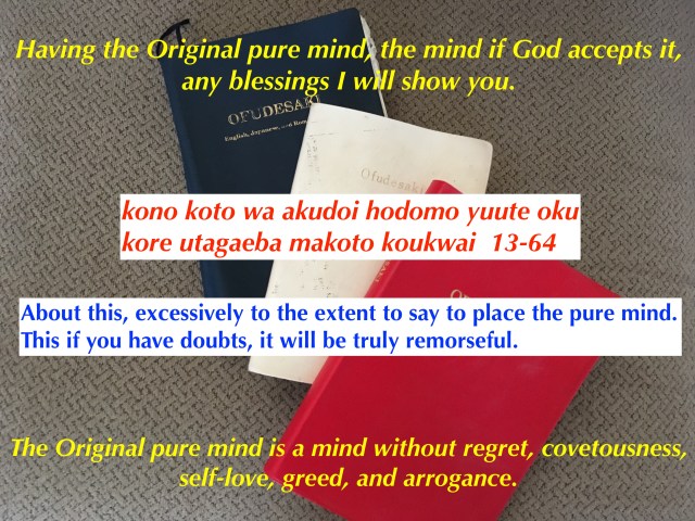 Because of this suffering and evil behavior of God’s children, God descended from heaven to help us return to the Original pure mind. How do we remove illness or suffering from our bodies? We must understand the pure mind that was given to the first parents of human beings. This is a mind without disappointment, covetousness, self-love, greed, and arrogance. The simple solution is to eliminate these thoughts from our minds. For some of us, this will be simple to do, but for many, it will be difficult. For these people, the Ofudesaki gives us step-by-step instructions, to accomplish this. Please read the most accurate English translation of the Ofudesaki.