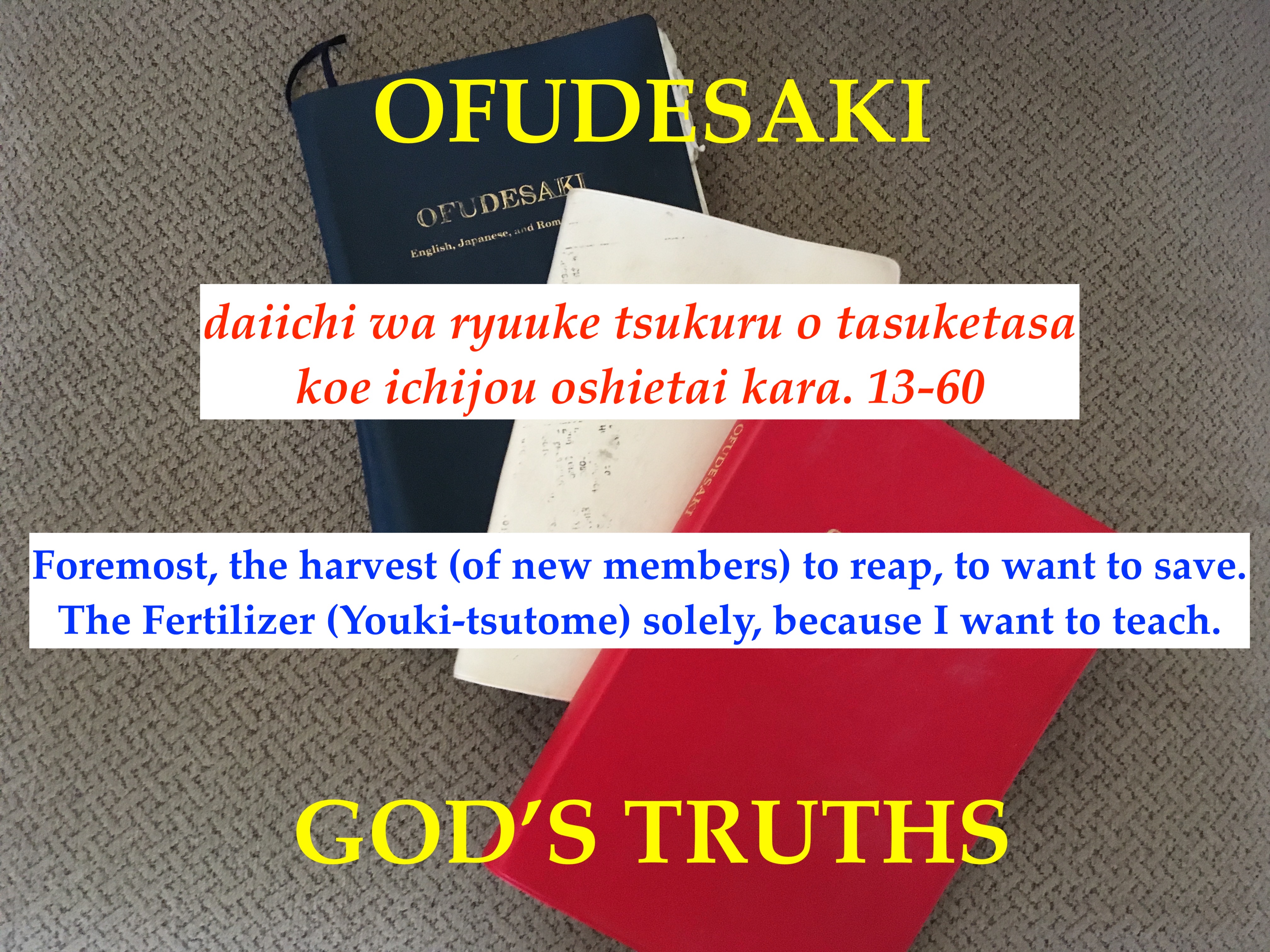 I believe we as a church are depending on God to help us save the world. What do I mean? We are performing the Yorozuyo and 12 songs, hoping God to save us and the world. We are offering food in front of God to ask for blessings. We are emphacizing the return to Ojiba to thank God for many blessings. I can go on, but what does God want us to do. God tells us in the Ofudesaki, that we must spread the teachings that are in the Ofudesaki to others. What truths must we spread? It is the truth about the soul (mune), pure mind (shinjitsu), and God’s guidance (juuyou, and you) that we must spread to the world. These truth, the world does not know, and understand.