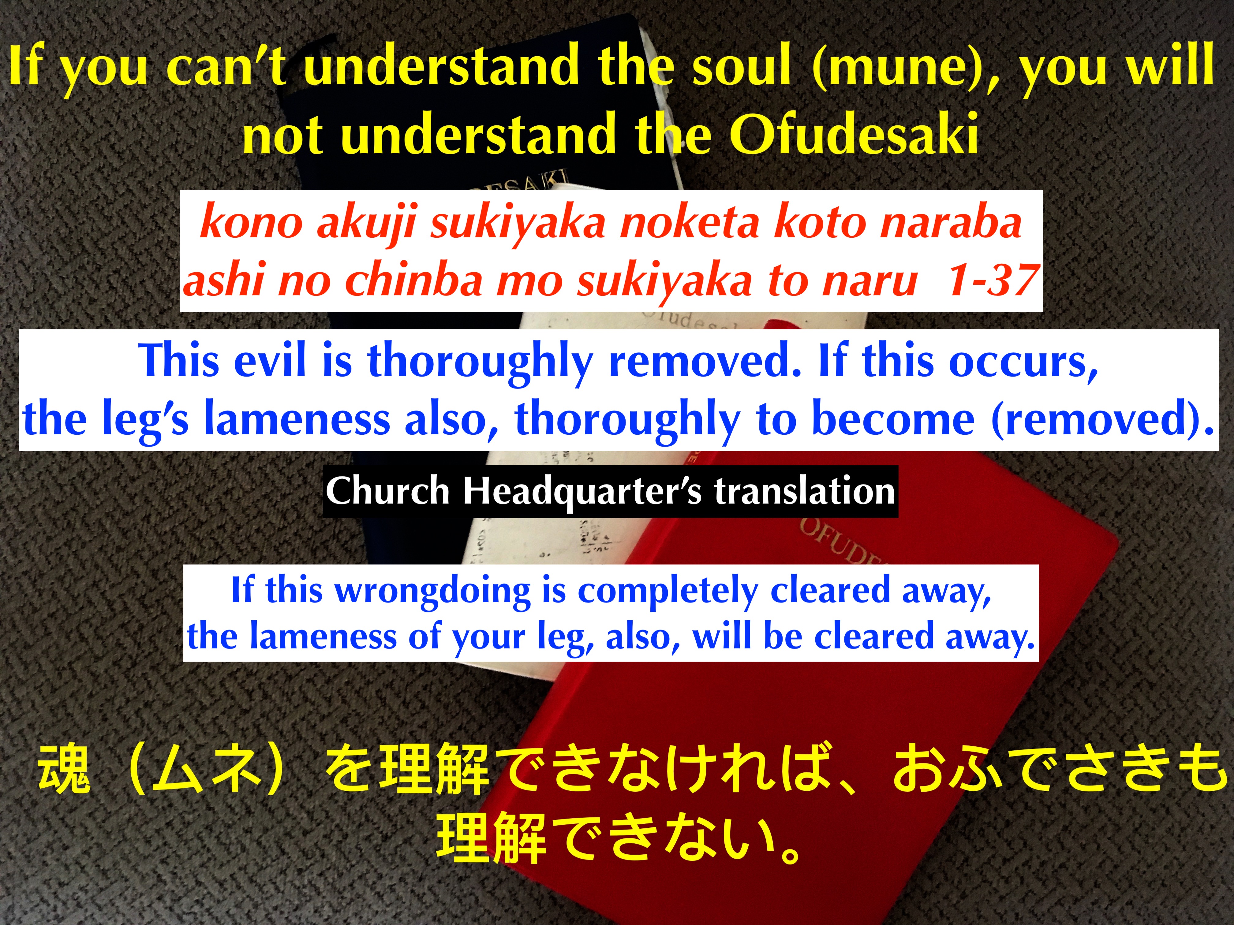 Again, the teachings in the Ofudesaki are very simple, from a loving God. Remember God does not want to be worshipped. But God wants to see all God’s children live a happy and healthy life. This can be only accomplished if we understand our own souls.